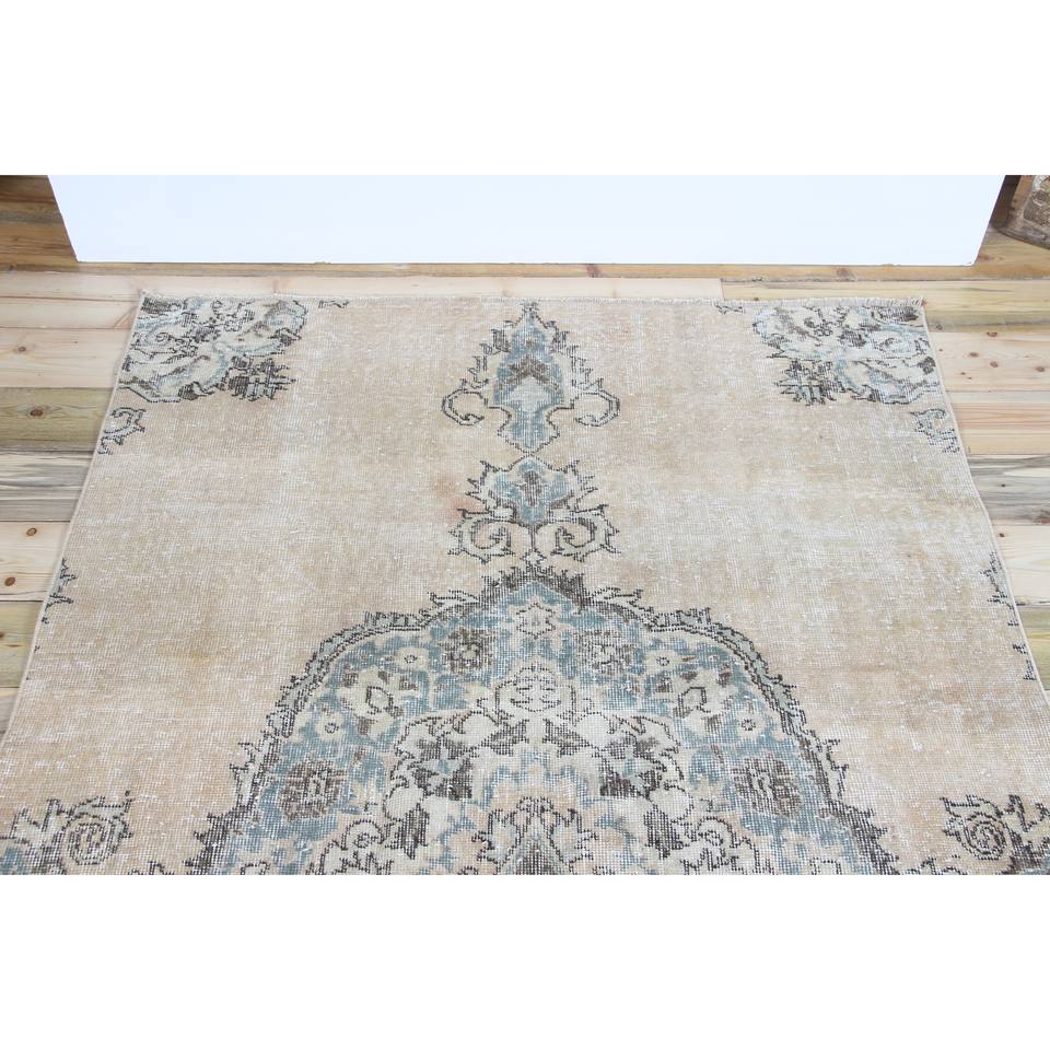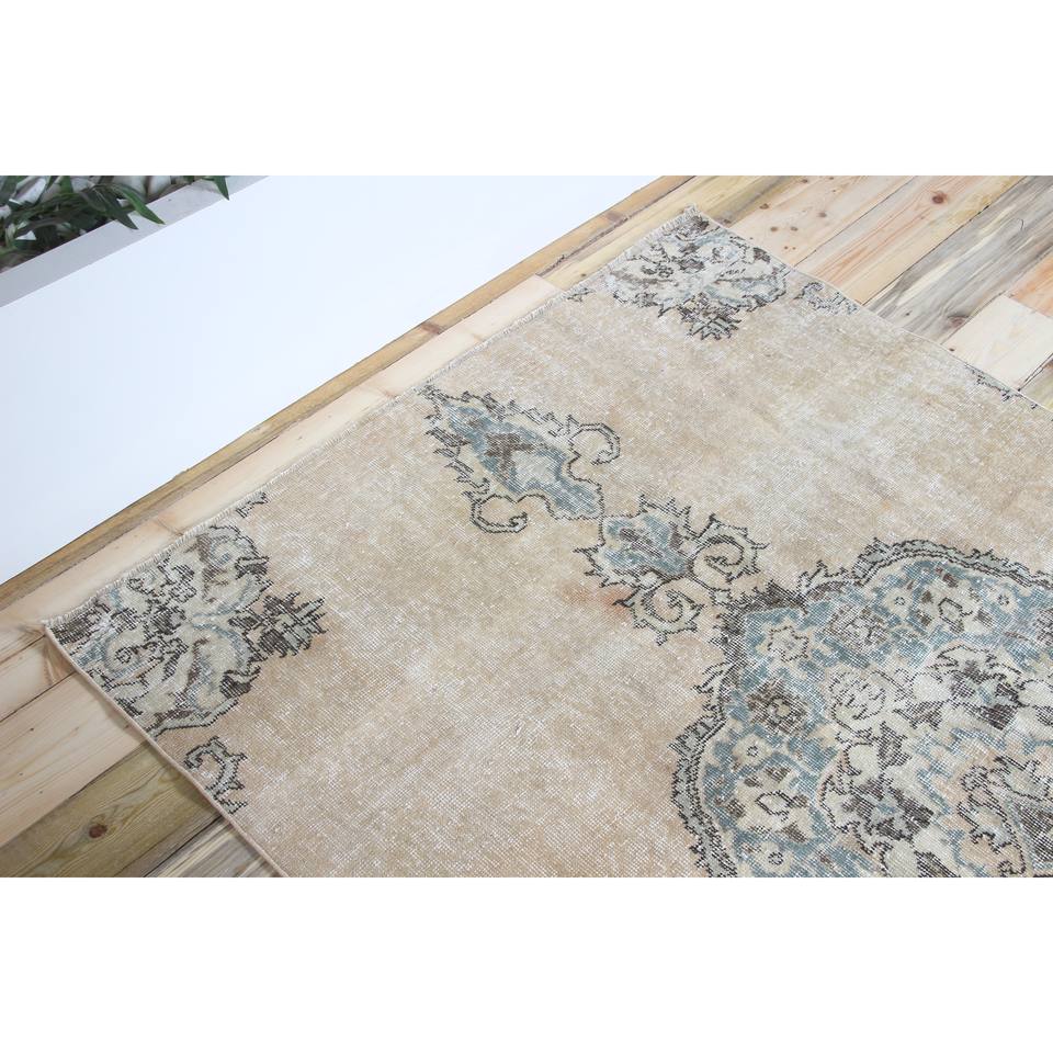 Alfombra Vintage de 4.3x7.1 pies, Alfombra Turca, Alfombra de Lana con Diseño Floral Marrón y Azul