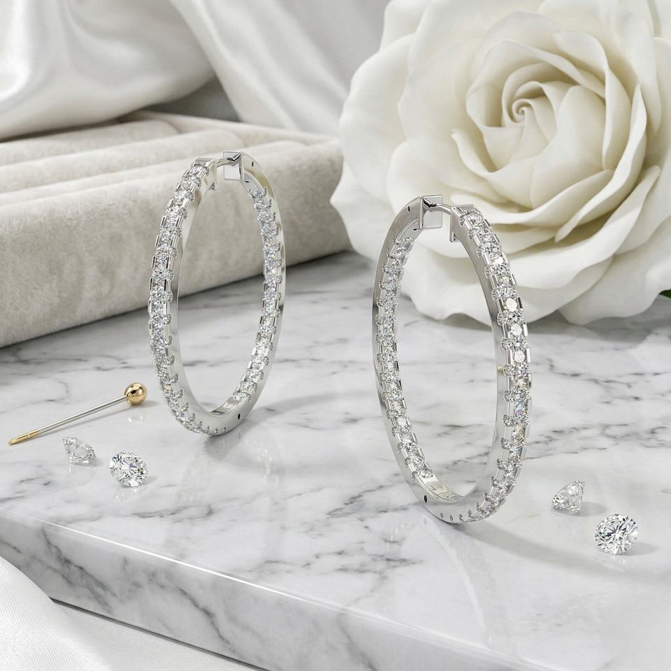 Pendientes de Aro Grandes con Incrustaciones de Diamantes Redondos de 4.40CTW, Oro de 14k, Diamantes Cultivados en Laboratorio, Color E-F, VVS2, Aros de Lujo para Mujer