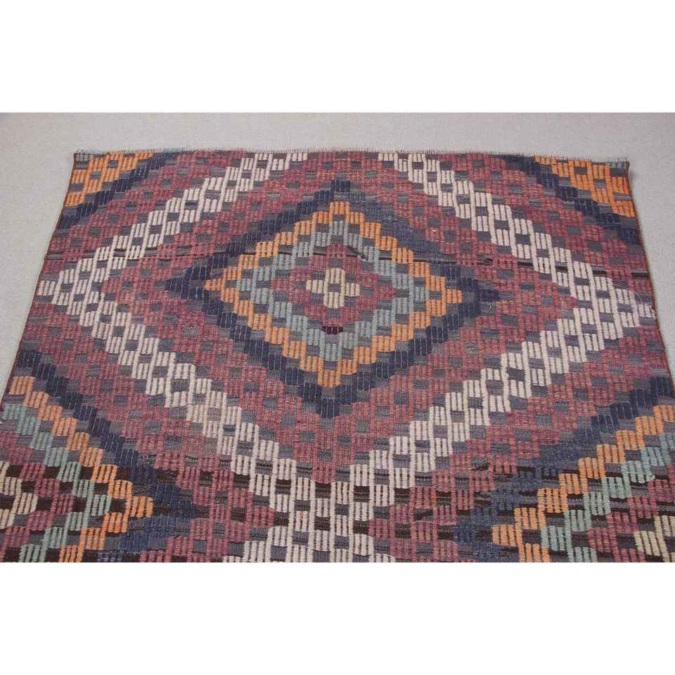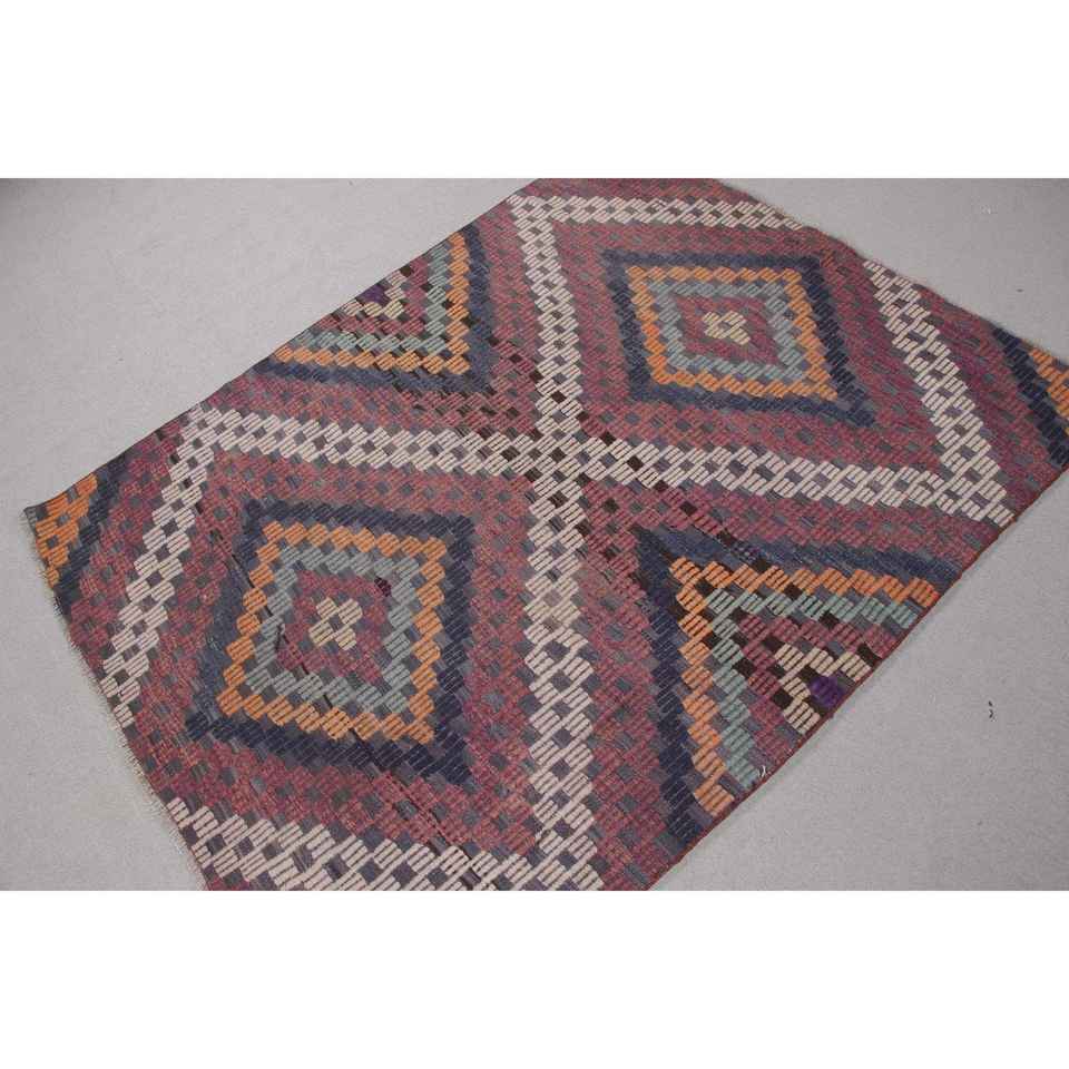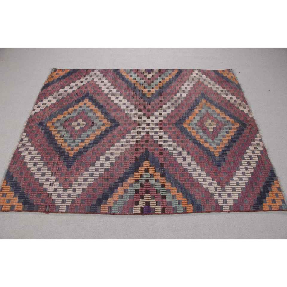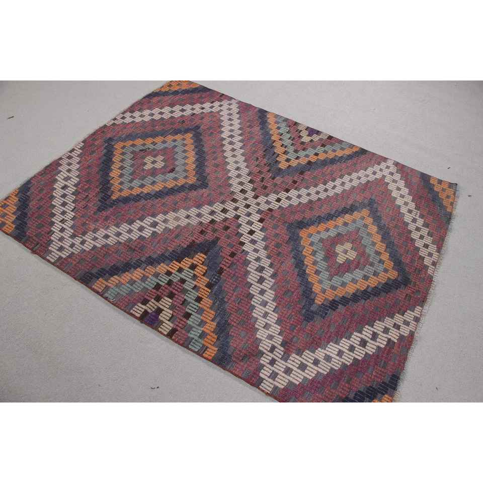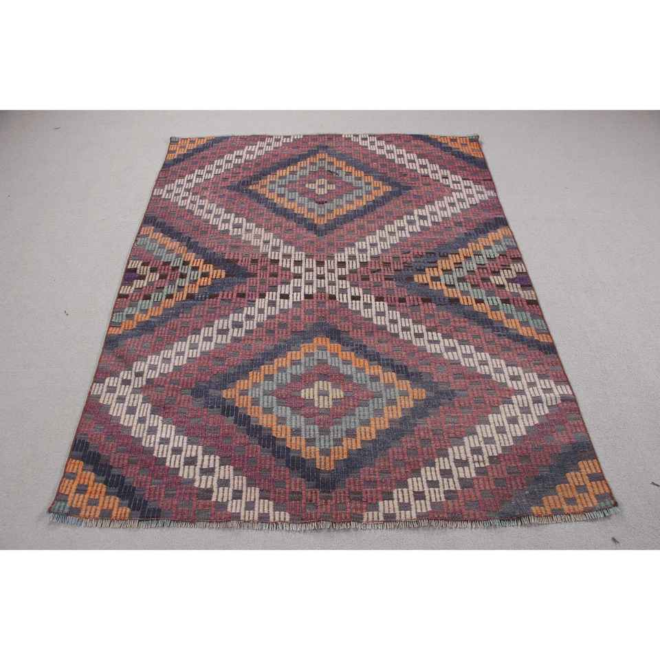 Alfombra Vintage de 4,4x5,4 pies, Alfombra Turca, Alfombra de Camuflaje Azul y Roja