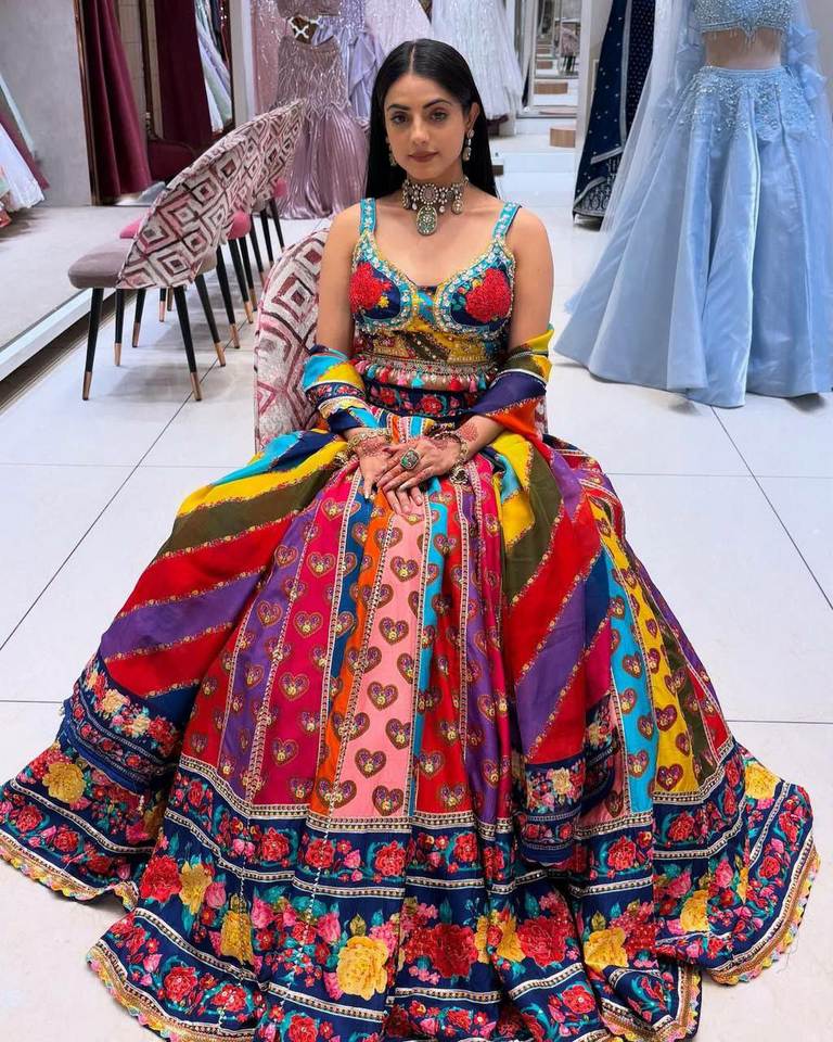 Espejo bordado multicolor acampanado de 4,5 metros y tela de Georgette de imitación con trabajo de piedra Fancy Lahenga Choli con Cancan y Canvas Patta