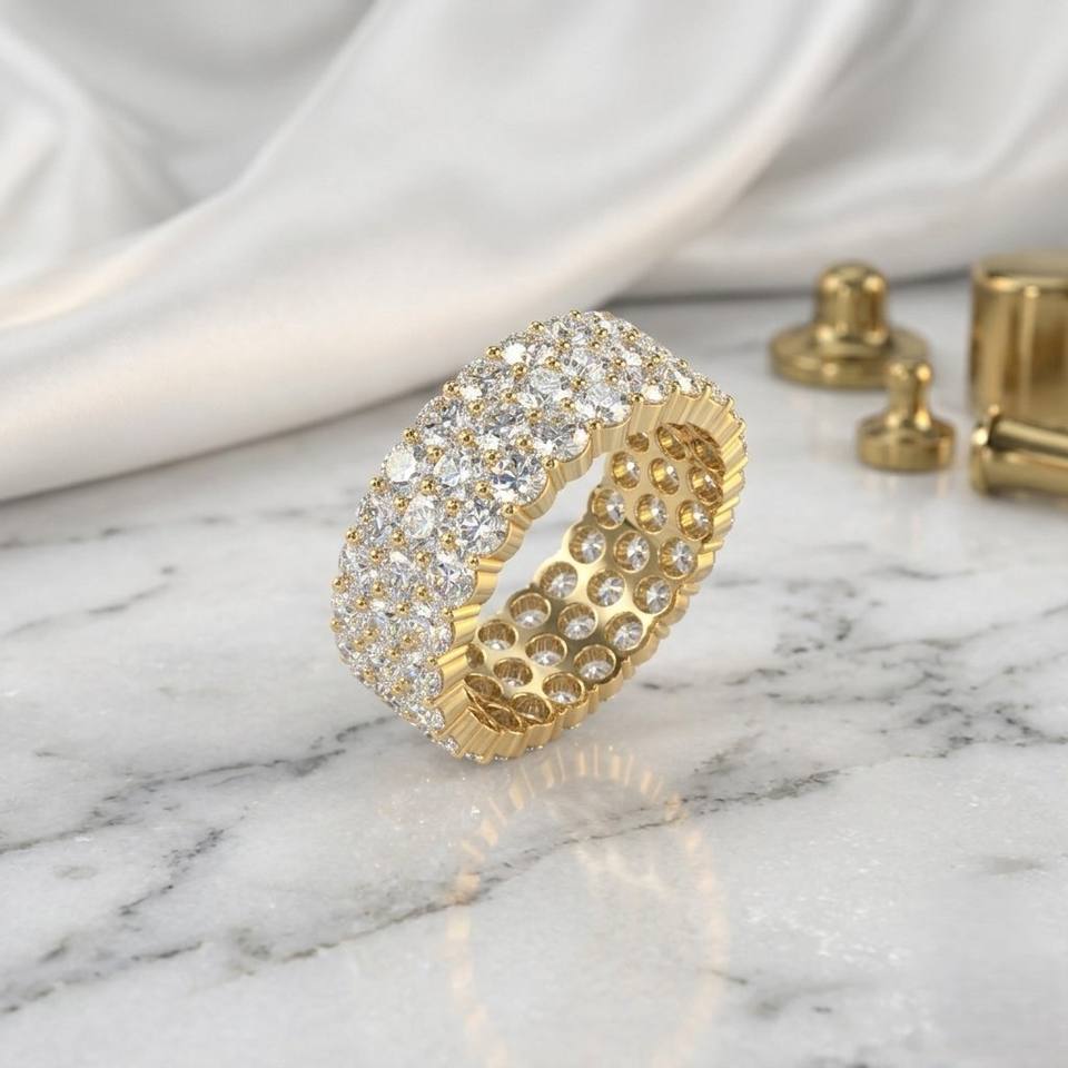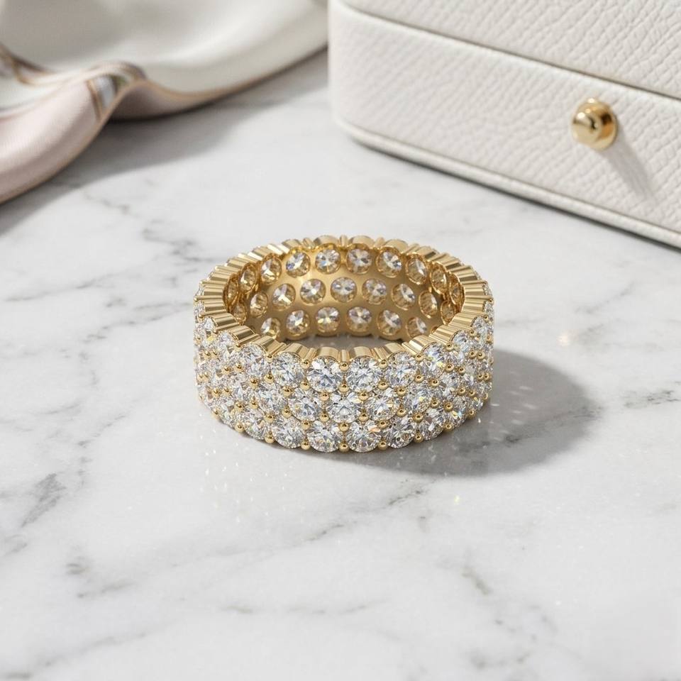 Anillo de Eternidad Certificado de Oro de 10K con 4.70CTW de Diamantes Cultivados en Laboratorio, Corte Redondo, Engaste Pavé, Triple Hilera, Estilo Vintage