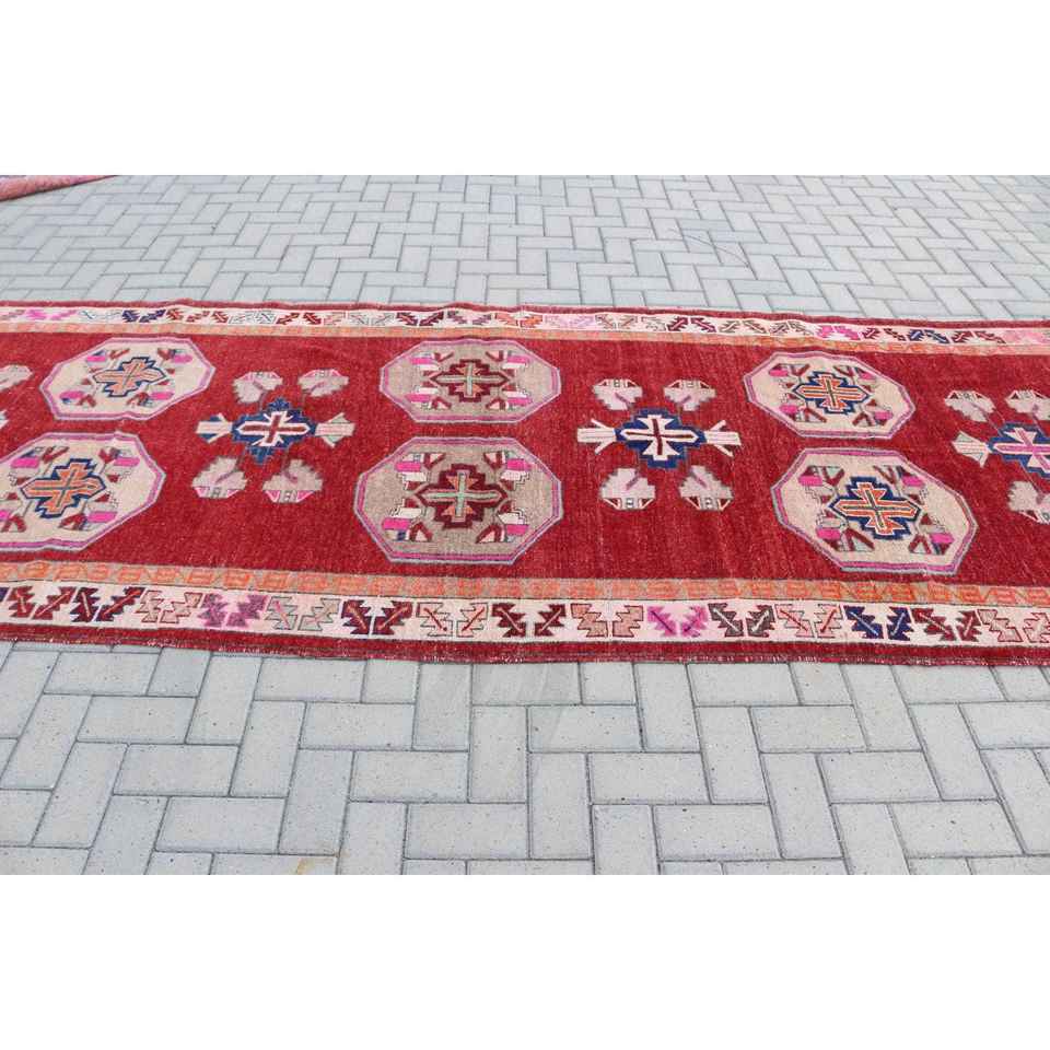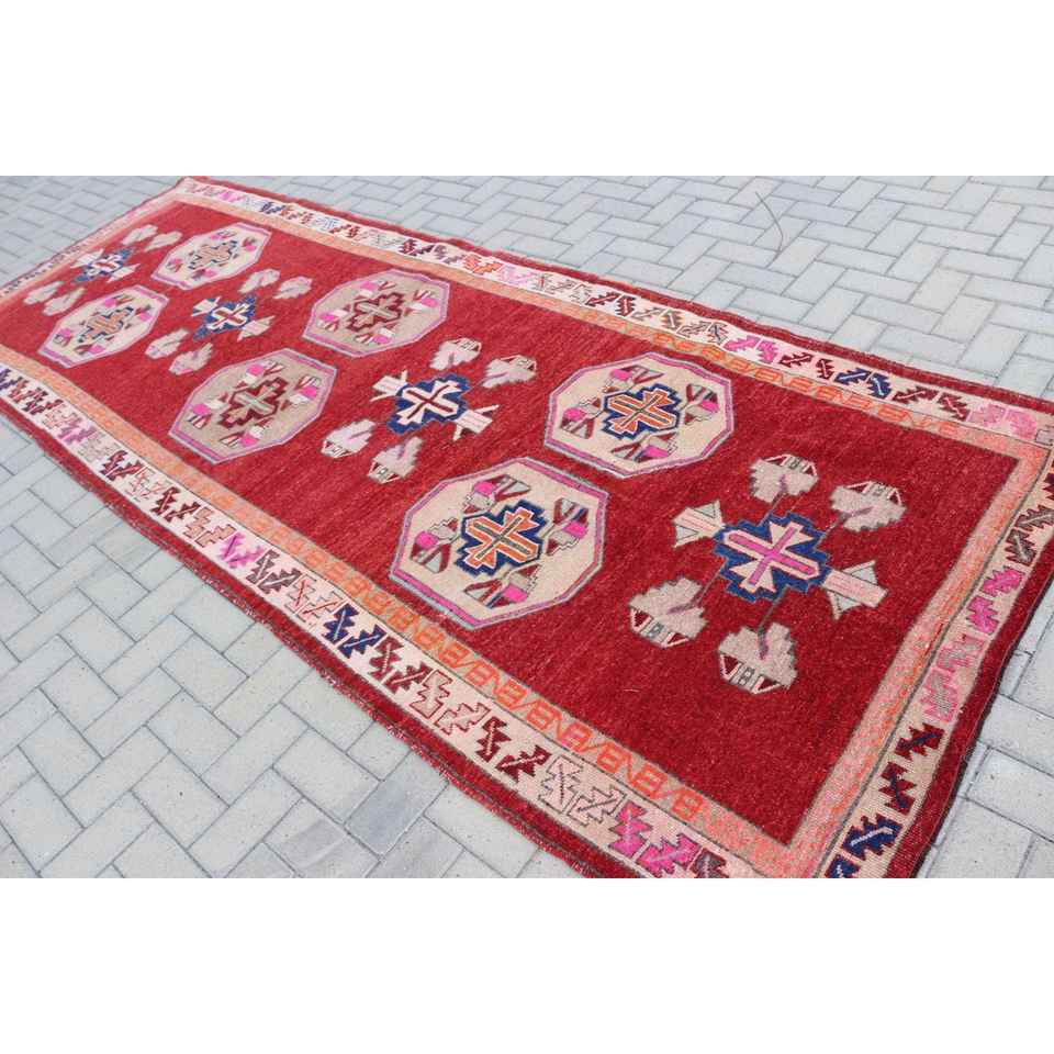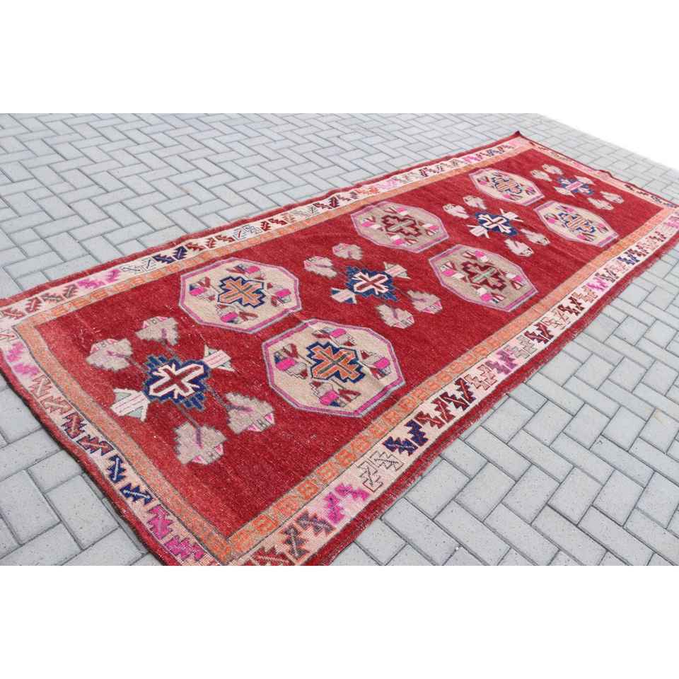 Alfombra Turca de 4.7x12.2 pies, Alfombra Vintage, Alfombra de Lana con Diseño Floral Rojo