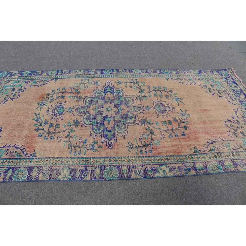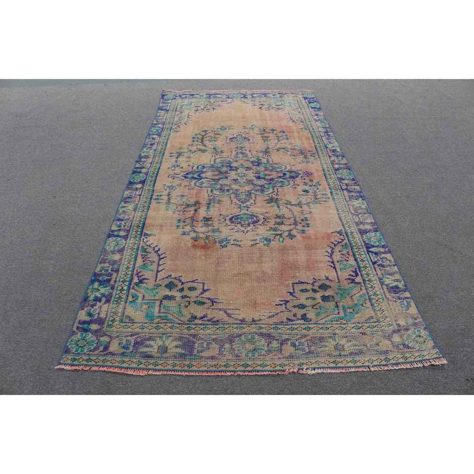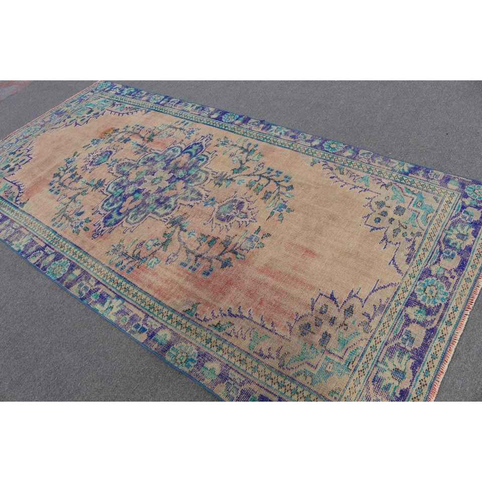 Alfombra Turca Vintage de 4.9x9.6 pies, Alfombra Grande Azul y Roja con Parches de Lana y Respaldo de Látex, Alfombra Tradicional Ecológica para el Hogar