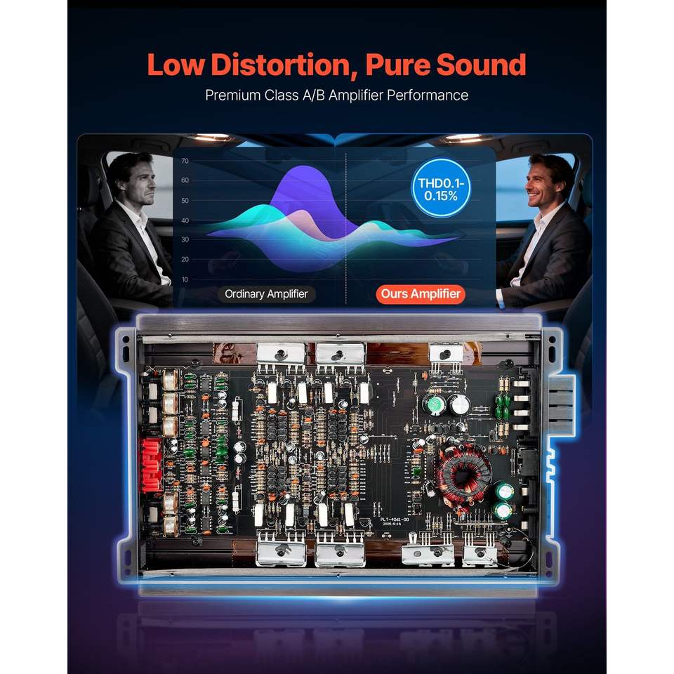 Amplificador de Audio para Auto de 4 Canales, Estable a 2 Ohmios, Clase A/B, Rango Completo, 4 x 200W a 4 Ohmios o 4 x 400W a 2 Ohmios de Potencia de Salida