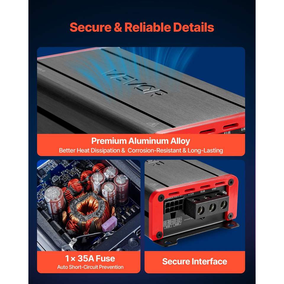Amplificador de Audio para Auto de 4 Canales, Clase D, Estable y Bridable, Potencia Máxima de Rango Completo 4 x 120W a 4 Ohmios / 4 x 200W a 2 Ohmios, Rango Completo 4 x