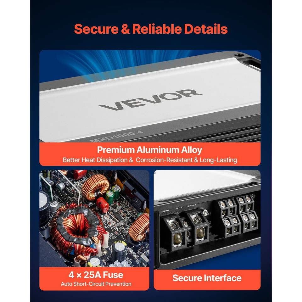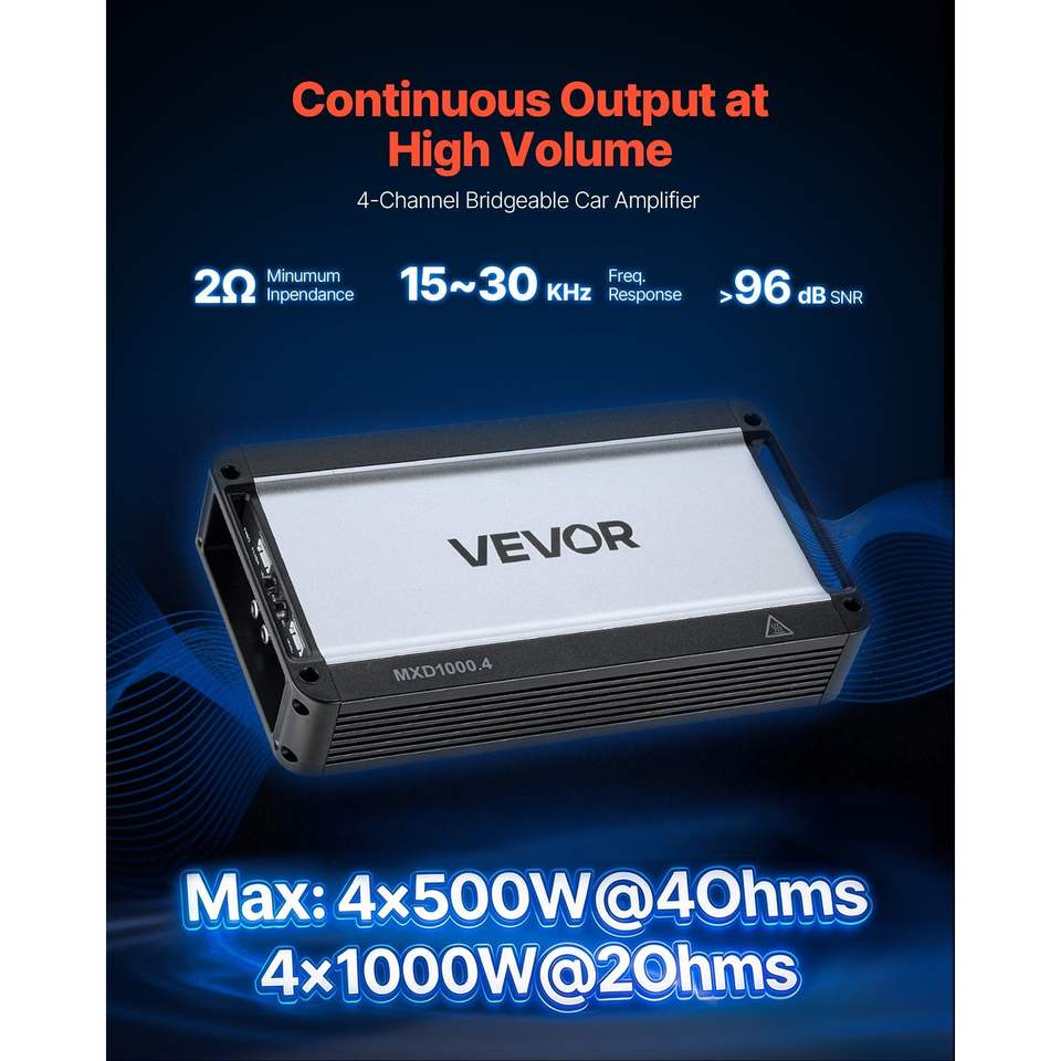 Amplificador de Audio para Auto de 4 Canales, Clase D, Estable y Bridable, Rango Completo, Potencia Máxima 4x500W@4Ohm/4x1000W@2Ohm, 2 Ohmios