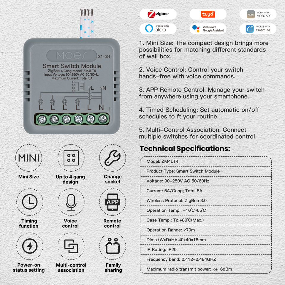 Módulo de Interruptor Inteligente Mini de 4 Canales MOES Tuya WiFi, Relé con Temporizador, Automatización del Hogar, Control Remoto por Aplicación, Compatible con Alexa, Google Home, Apple