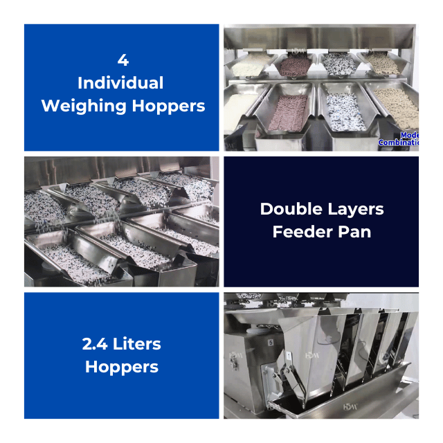 Motor, PLC, Pantalla táctil a color de 10,4 pulgadas, Puerto USB 2,0, Opción para el interruptor del pedal del pie, Cubierta de protección completa, Cuerpo de máquina lleno SS304, Tolvas del volumen 2.4L, 4 Control de pesaje individual, Cubierta de protección