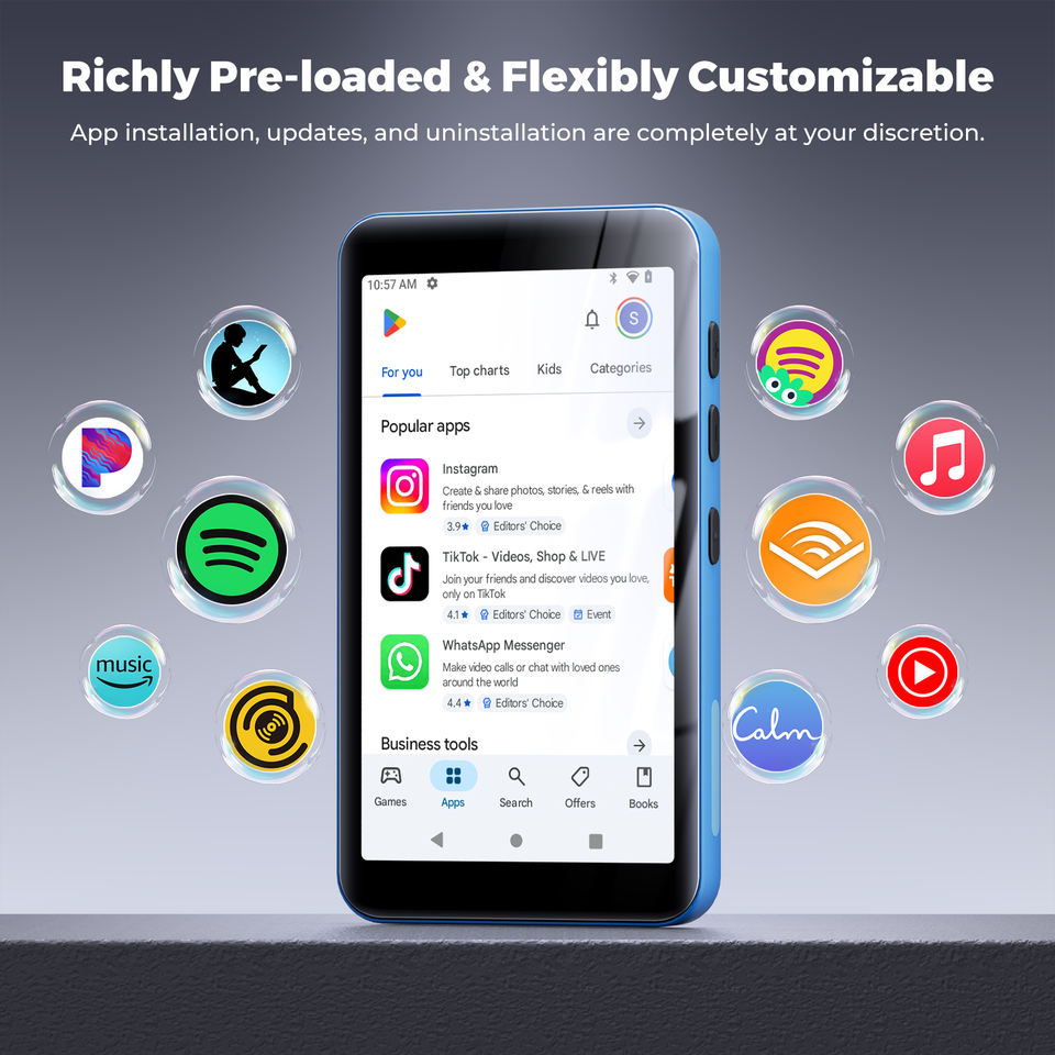 Reproductor MP4 Android con Pantalla Grande de 4 Pulgadas, 3+32 GB de Almacenamiento, WiFi, Altavoz Integrado, Aleación de Zinc, Compatible con GMS, Colores Personalizables