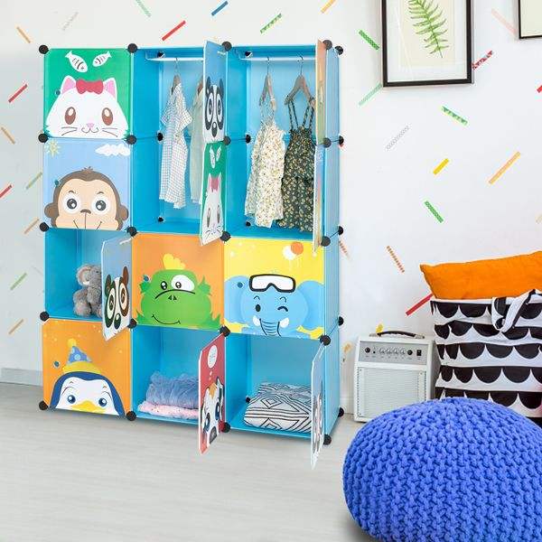Armario de 4 niveles y 12 compartimentos con diseño de animales, tipo cubo de Rubik, de plástico y alambre de acero, 105*35*140cm, 2 barras colgantes para conjuntos de muebles infantiles