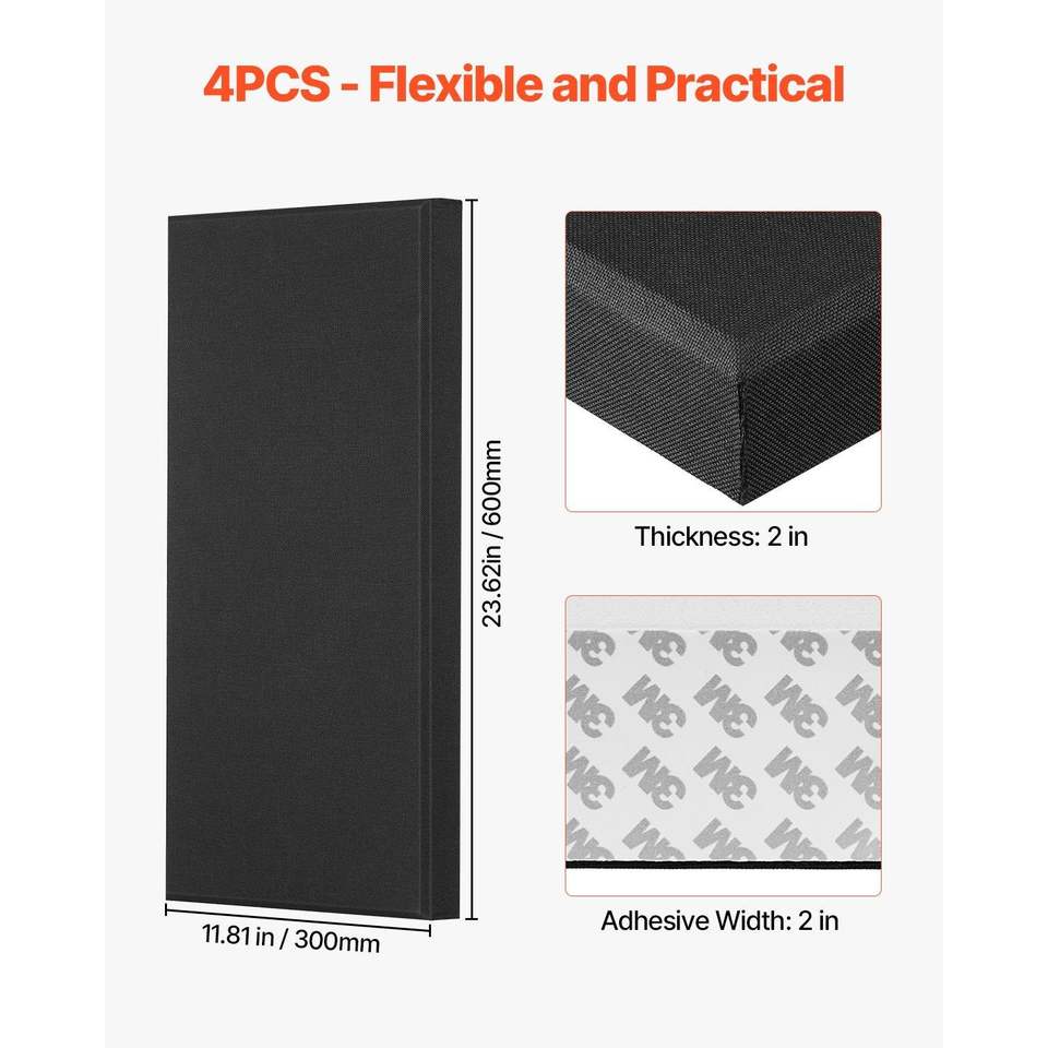 4 Paneles Acústicos de 2 Pulgadas de Grosor, 23.6 x 11.8 Pulgadas, Paneles de Fibra de Vidrio Autoadhesivos para Absorción de Sonido, para Hogar u Oficina