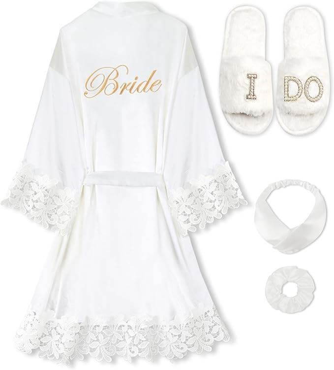 Conjunto de 4 Piezas de Bata de Novia para el Día de la Boda, Bata de Novia con Pantuflas, Ribete de Encaje, Bata de Novia para Despedida de Soltera
