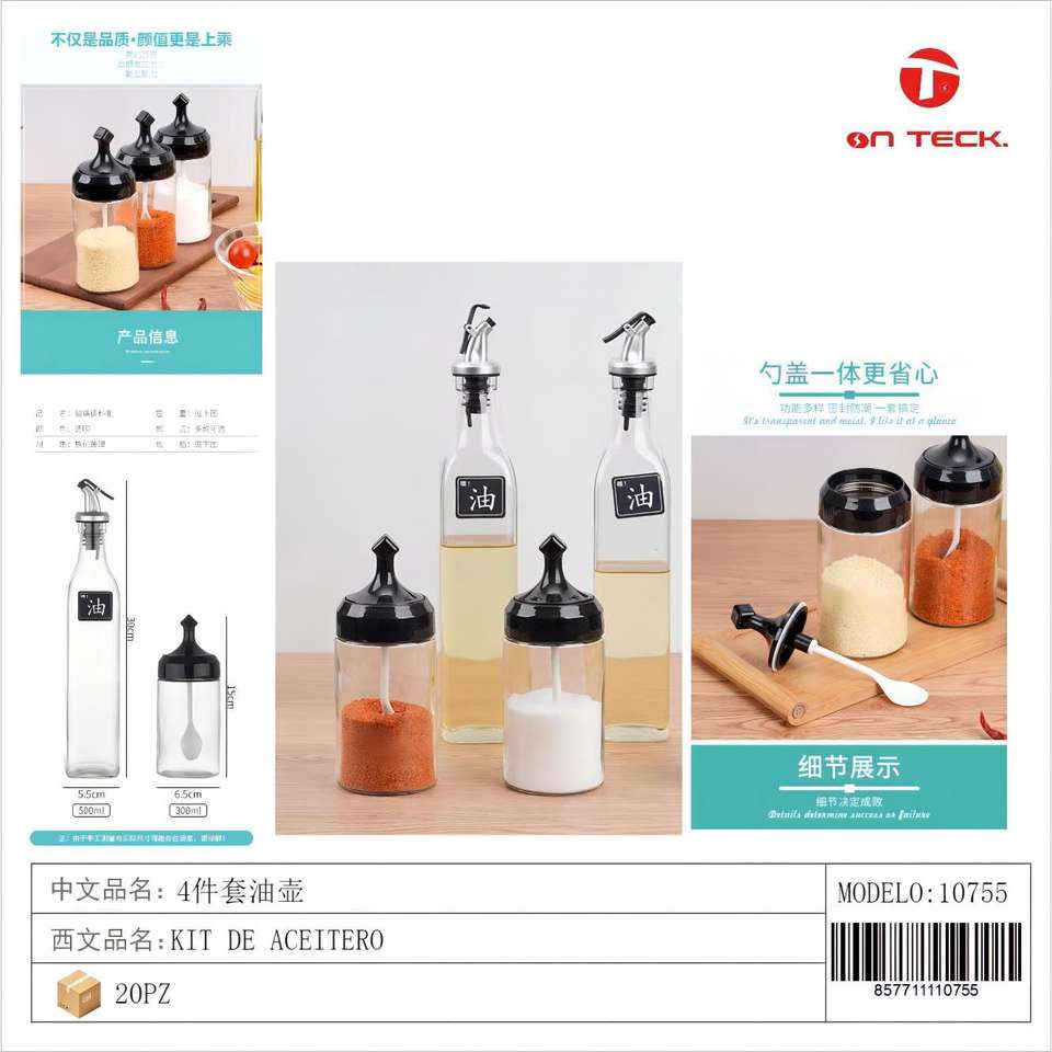 Juego de dispensadores de aceite ONTECK de 4 piezas, botella de cocina duradera, dispensador de especias de vidrio con tapa para cocinar