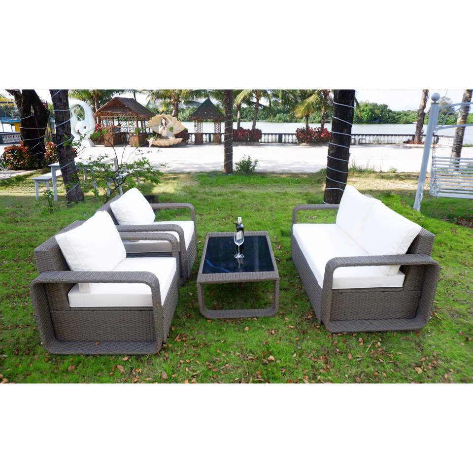 El juego de jardín de ratán PE de 4 piezas incluye 2 cómodos sillones, 1 Loveseat, 1 mesa de centro con tapa de cristal para uso en exteriores