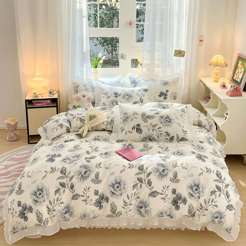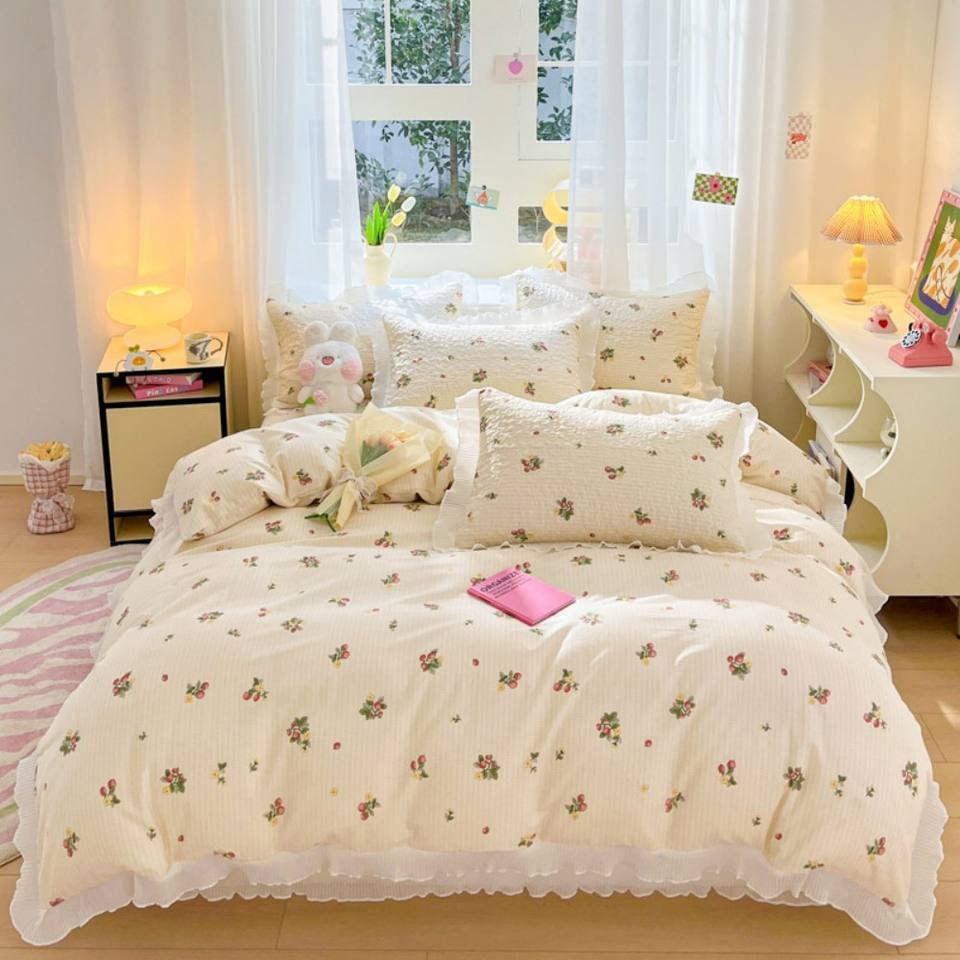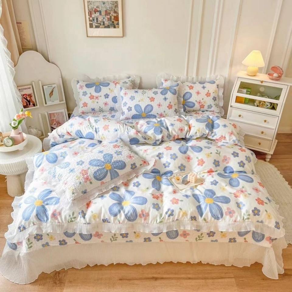 Juego de 4 piezas de estilo princesa, colcha de algodón 100% inspirada en Corea, 1,5 m, 1,8 cama, ropa de cama 100% algodón y colcha recortada de gasa