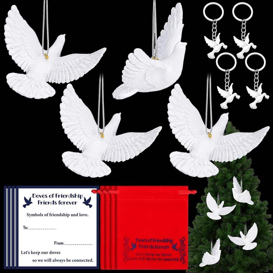 Juego de 4 Adornos Navideños de Resina Blanca con Forma de Tortuga y Paloma, Bolsa Roja, Dos Llaveros de Tortuga y Paloma, Tarjetas de Amistad - Regalos de Adornos