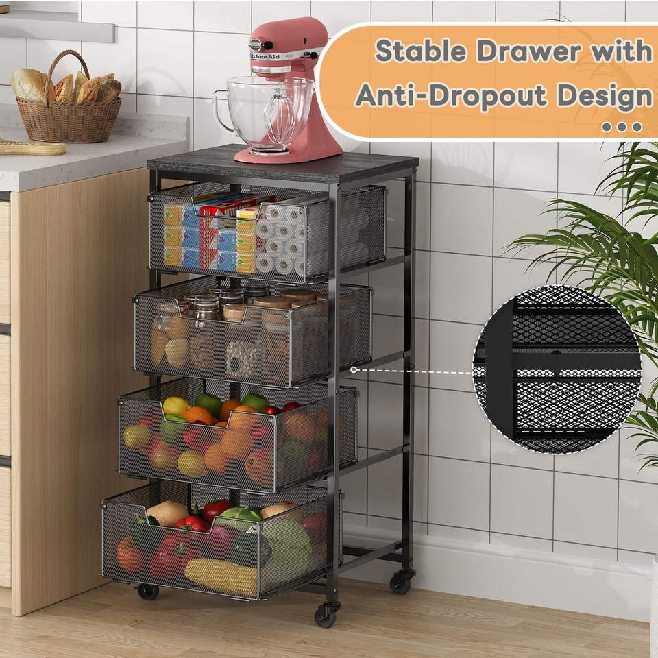 Carro de almacenamiento de frutas y verduras de 4 niveles, organizador de cocina con ruedas, parte superior de madera, alambre de Metal, soporte para frutas y verduras con cajones