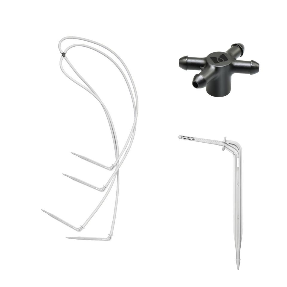 Kit de estacas de 4 vías con flechas de gotero para invernadero, vivero, huerto, viñedo, eficiente sistema de riego por goteo multiplanta