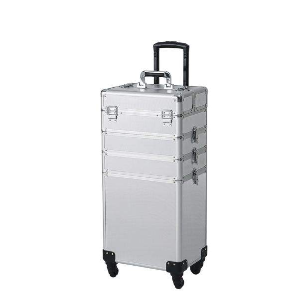 Maleta de Maquillaje Rodante de Aluminio Plateado con Barra de Arrastre Intercambiable 4 en 1, Bolsas y Estuches para Cosméticos
