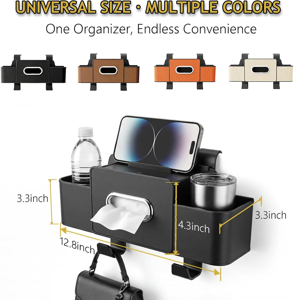 Organizador Multifuncional 4 en 1 para Asiento Trasero de Coche con Dispensador de Pañuelos, 2 Portavasos, Soporte para Teléfono y Ganchos