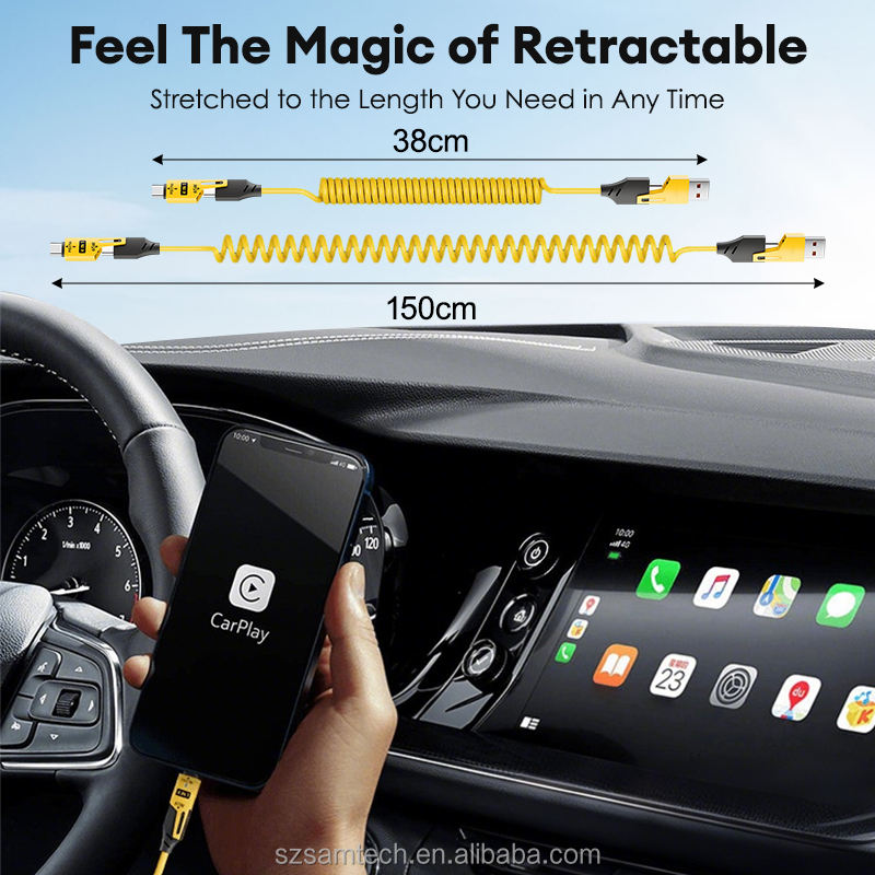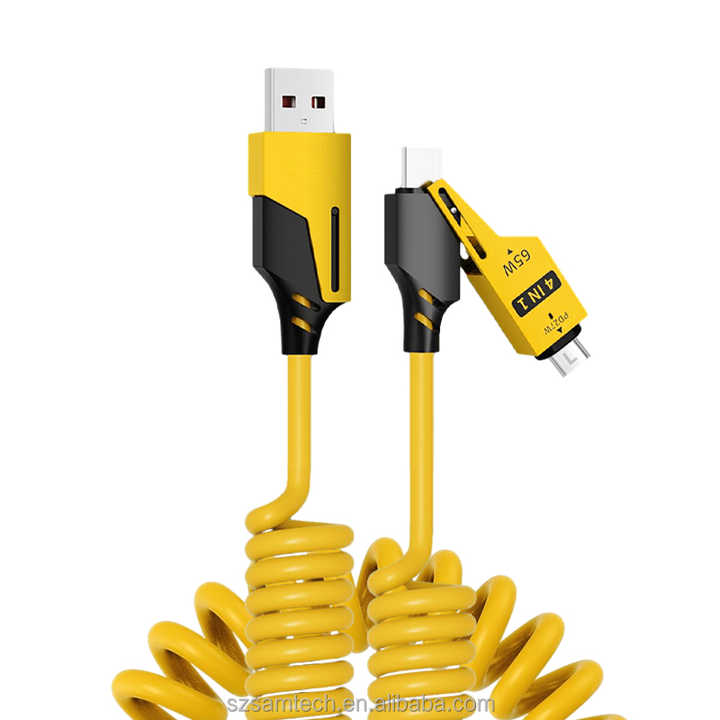 Cable de resorte 4 en 1 Usb en espiral a L/Type-C 60W Cable de carga rápida Coche Android Auto Diseño compacto Carga multidispositivo