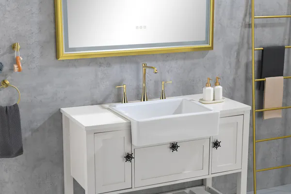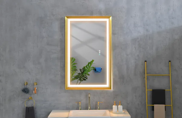 42 pulgadas W X24 pulgadas. H Espejo de tocador de baño de montaje en pared regulable antiniebla LED con marco dorado moderno de vidrio cuadrado de gran tamaño