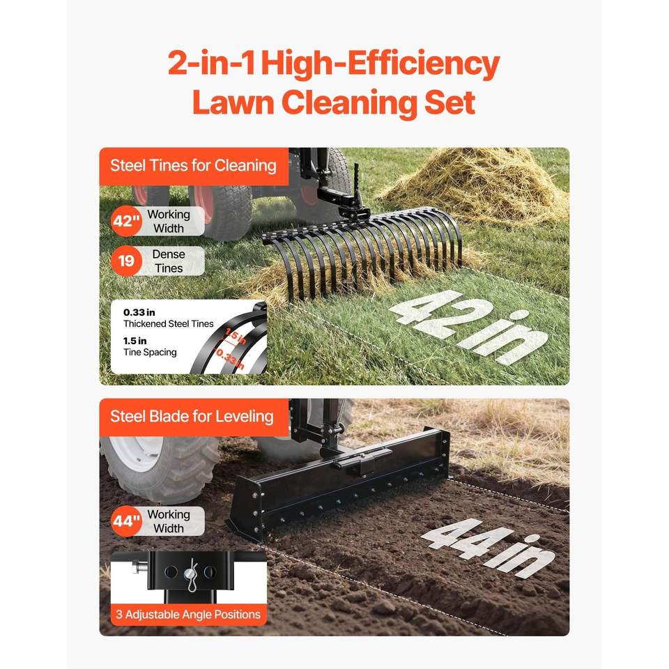 Rastrillo de paisajismo de 42 pulgadas para remolcar con palanca de elevación de cuchilla de rastrillo de 3 puntos para ATV, UTV y tractores de césped de categoría 1