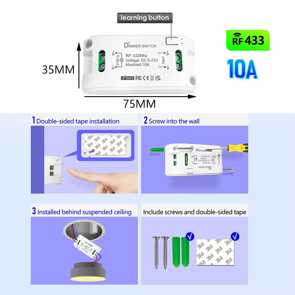 Interruptor de luz atenuador inalámbrico RF de 433 Mhz, Control remoto, CC 5V 12V 24V 72v, atenuador, Mini receptor de relé para lámpara de luz Led de Motor de CC