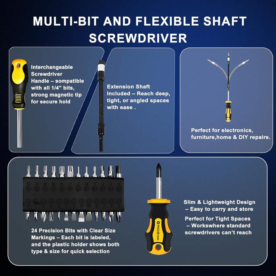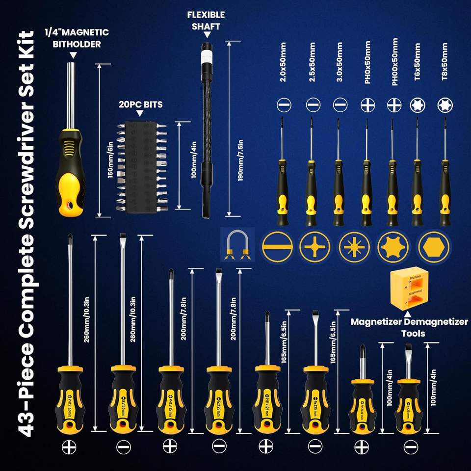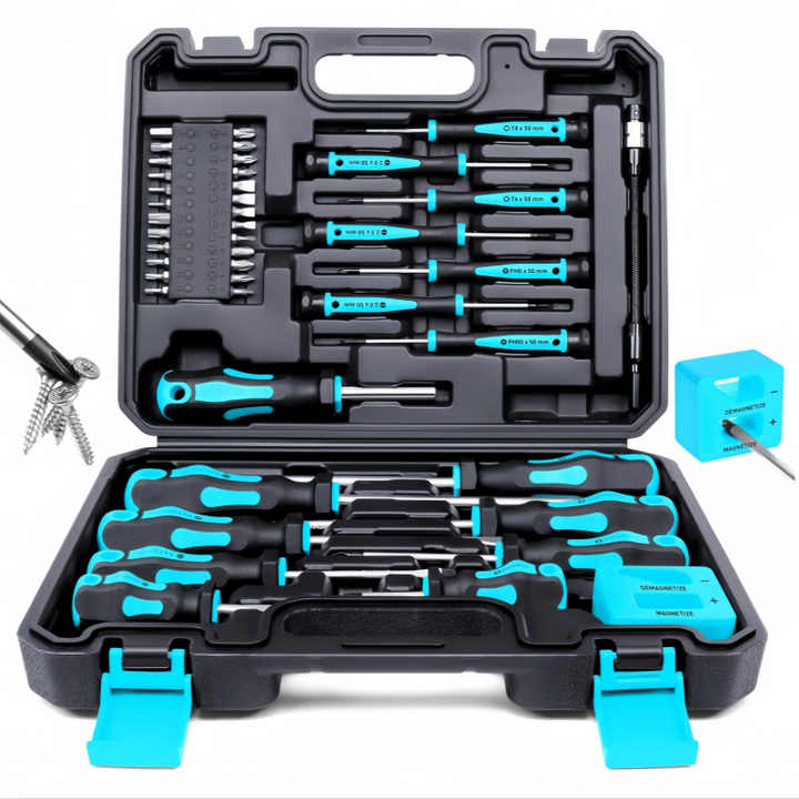 Juego de 43 Destornilladores Magnéticos con Puntas Intercambiables: Planas, Phillips, Hexagonales, Pozidriv, Magnetizador, Desmagnetizador