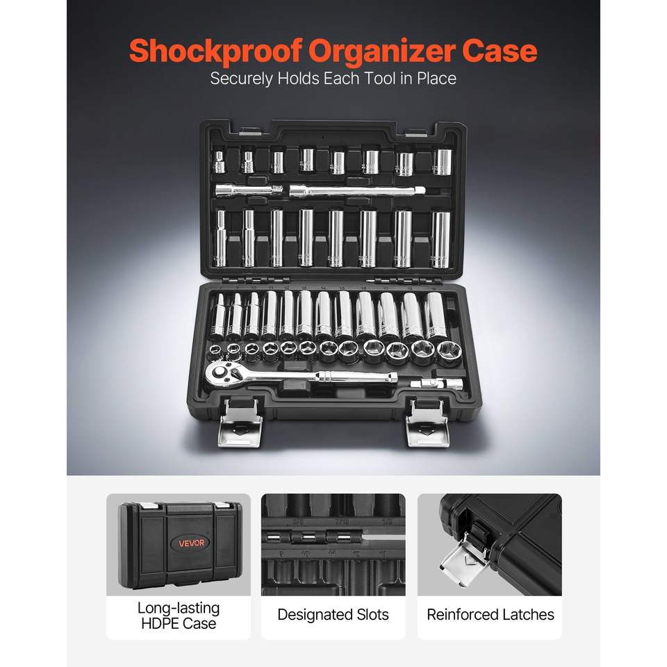Juego de Llaves de Trinquete de 44 Piezas con Enchufe de 3/8 Pulgadas, Juego de Herramientas Mecánicas Profundas y Superficiales SAE y Métricas con Accesorios