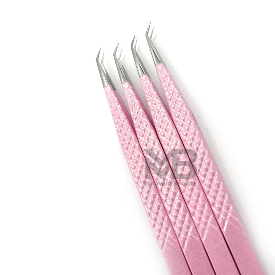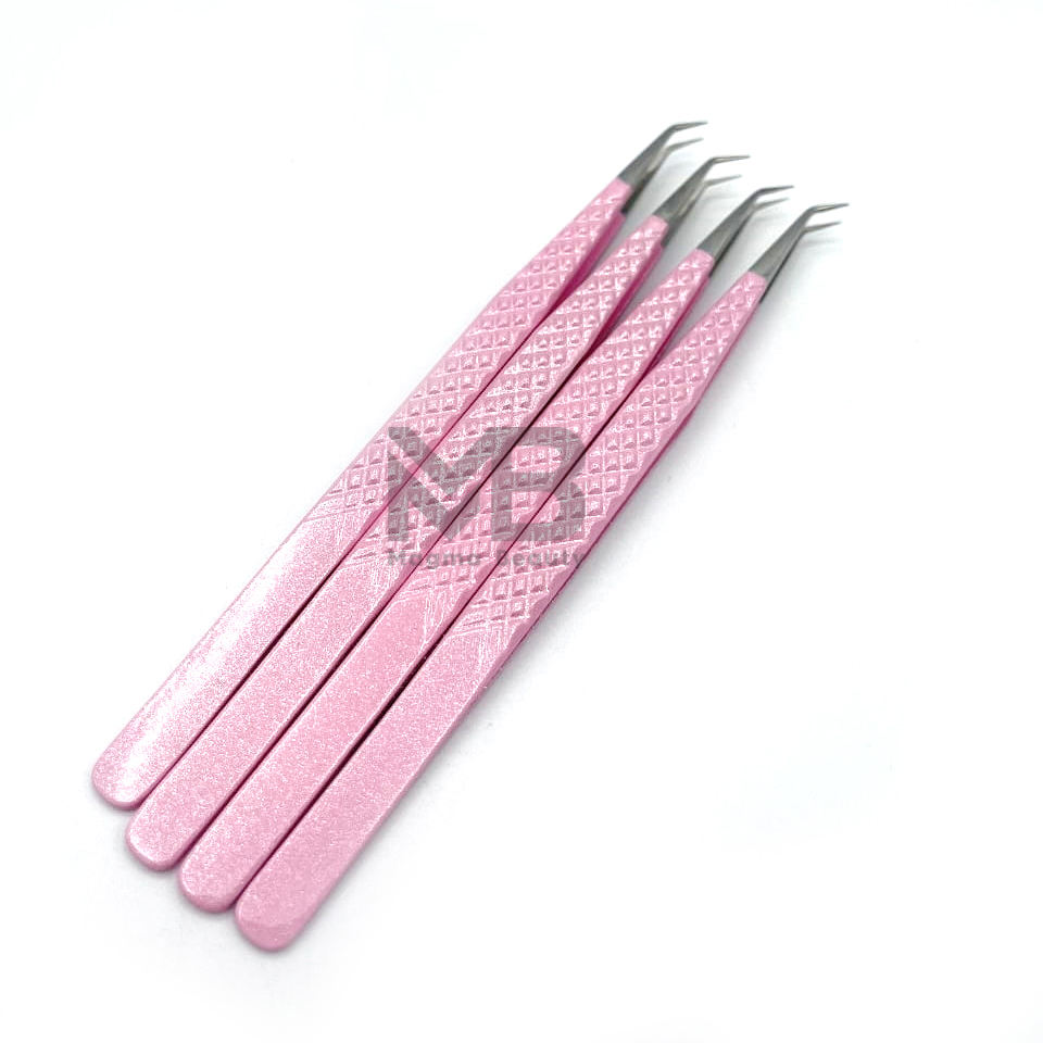 Pinzas de extensión de pestañas, puntas plateadas de agarre de diamante de aislamiento largo de 45 grados, acero inoxidable japonés, recubierto de Color rosa claro