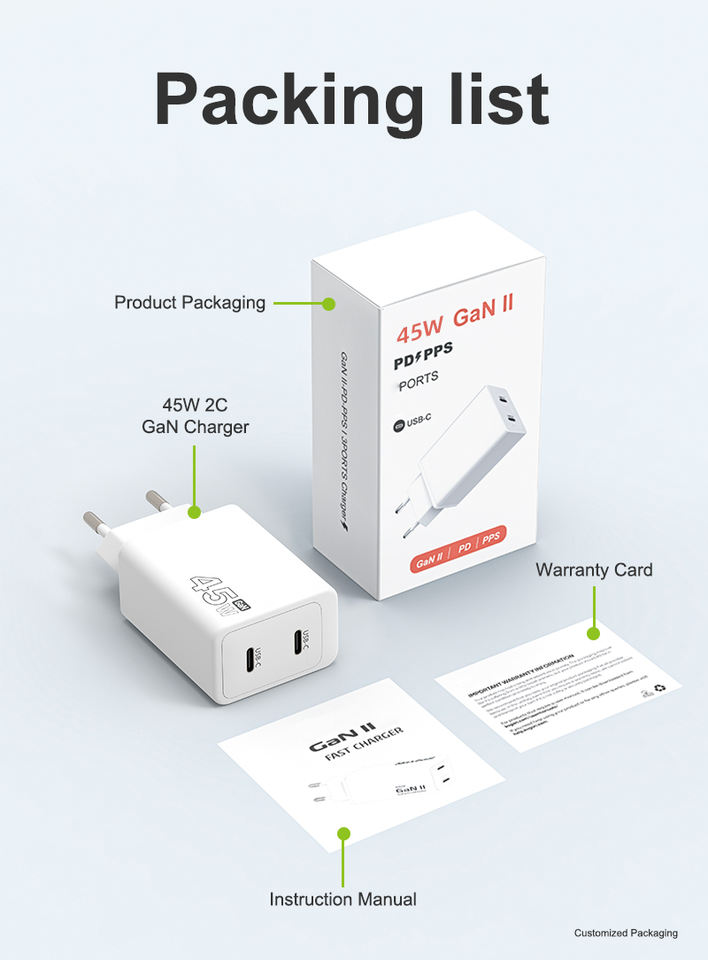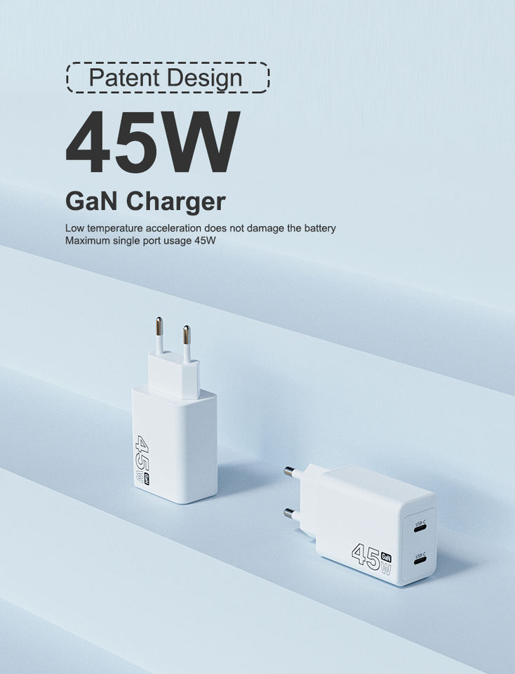 Cargador súper rápido USB GaN de 45W PD 3,0 QC3.0 2C Adaptador de 2 puertos para iPhone Samsung para teléfonos móviles y portátiles Compañero de viaje
