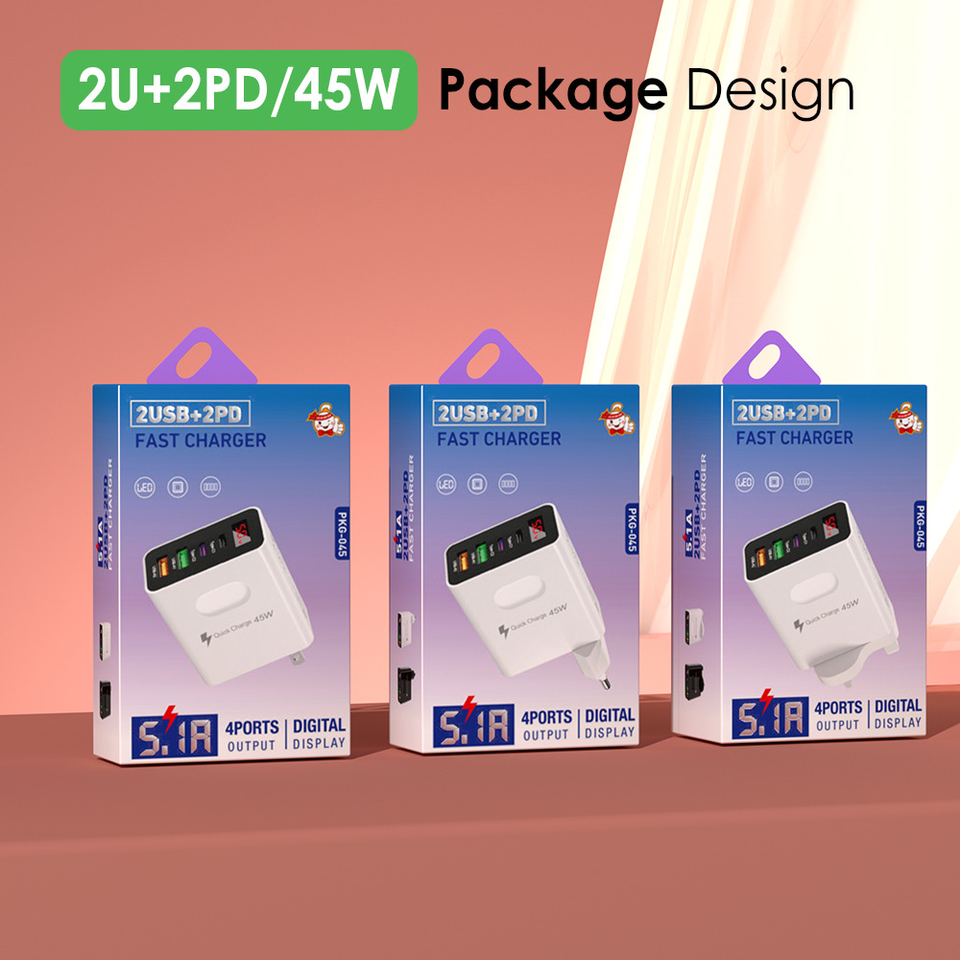 Cargador de Pared Digital LED de 45W, Nuevo, Adaptador de 5V 3.1A, 2 USB, 2 Tipo-C, 4 Puertos, Carga Rápida OTP para Apple, Samsung, Xiaomi
