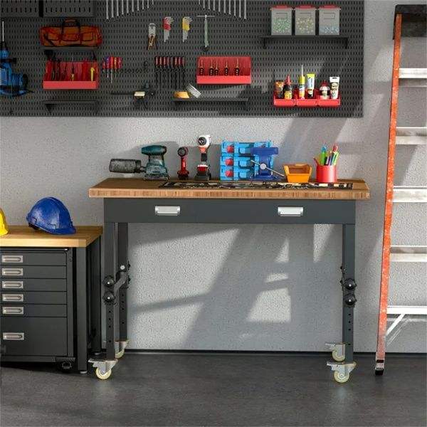 47\" Bamboo Tabletop Workbench with Adjustable Height Legs Drawer and Wheels-Garage Woodworking Workstation Tool Table