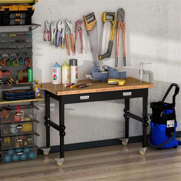 Mesa de Trabajo de Bambú de 47 Pulgadas con Patas de Altura Ajustable, Cajón y Ruedas - Estación de Trabajo para Carpintería