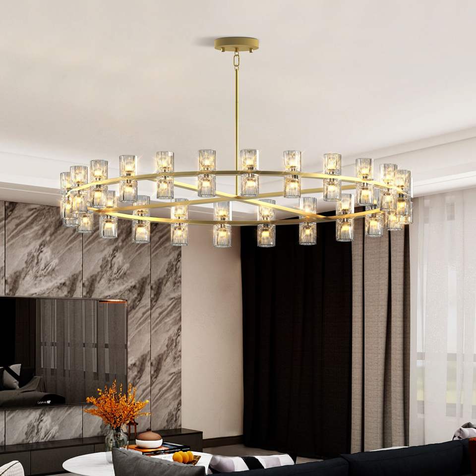Lámpara de Techo Estilo Granja Moderna de 48 Pulgadas con Forma de Rueda de Carro Dorada, 48 Luces con Pantalla de Cristal para Comedor, Cocina, Lámparas Colgantes