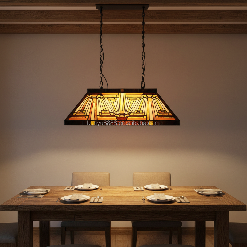 Lámpara de Techo Rectangular Tiffany de 48 Pulgadas con Vidrio de Colores y 6 Luces, Estilo Americano, Fácil Instalación para Comedor