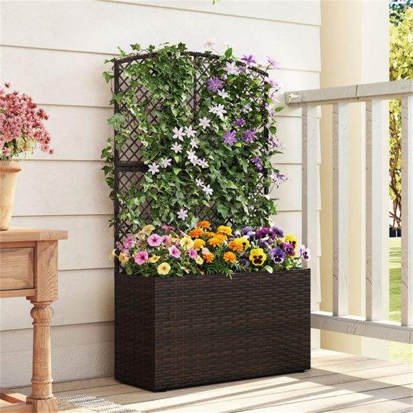 Jardinera Elevada de Mimbre Sintético Marrón de 49 Pulgadas con Soportes Ajustables, Enrejado y Cercado para Jardín Exterior