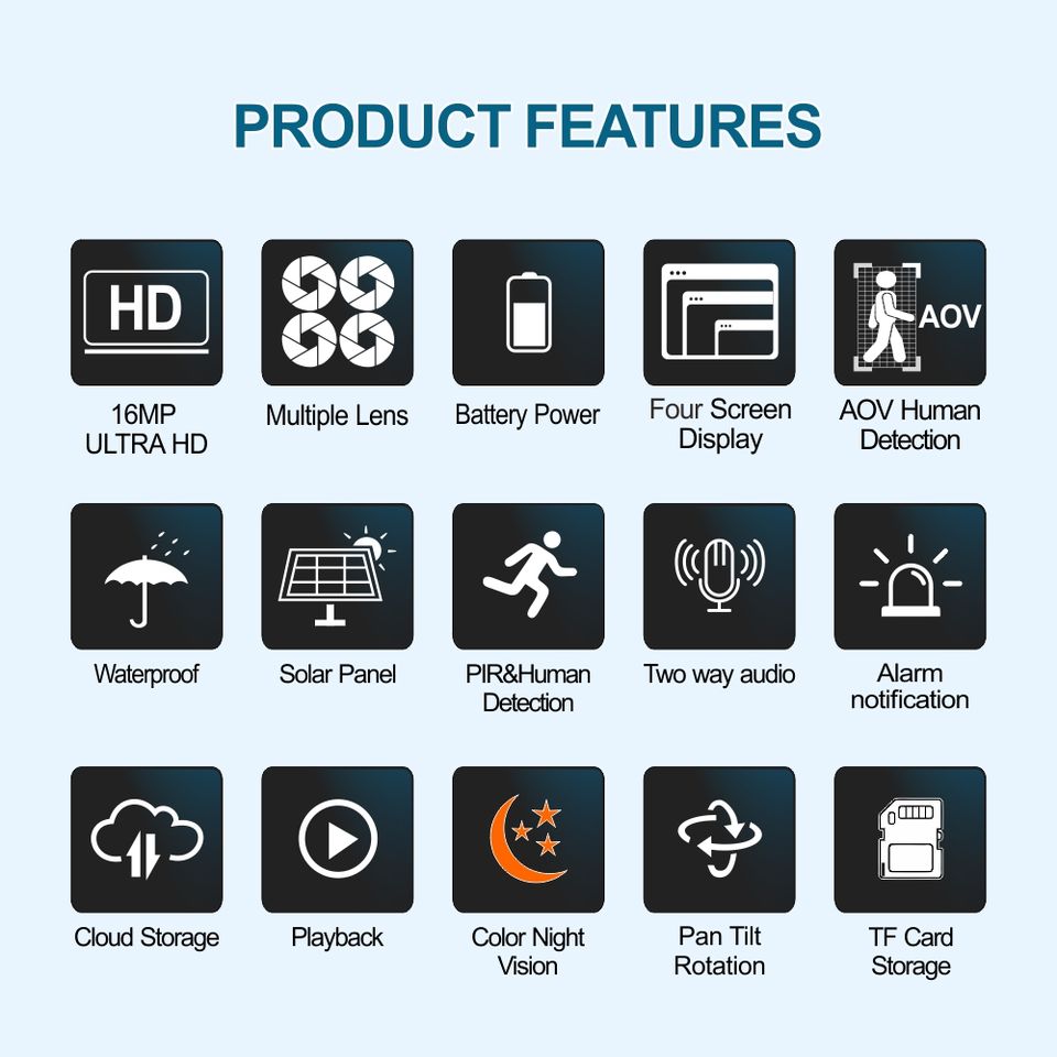 Detección de movimiento, Humanos de seguimiento de movimiento, Visión nocturna, Impermeable / a prueba de mal tiempo, PAN-TILT, De Audio de dos vías, Construido-En sirenaCaracterísticas especiales