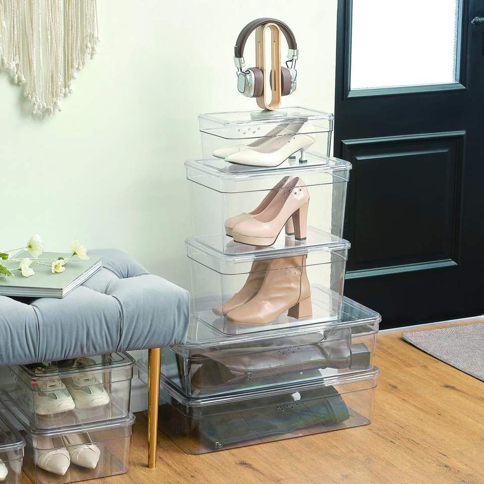 Paquete de 4 cajas de zapatos extra altas de plástico transparente brillante con tapa Tamaño adulto Un par por nivel Cajas de zapatos y organizadores