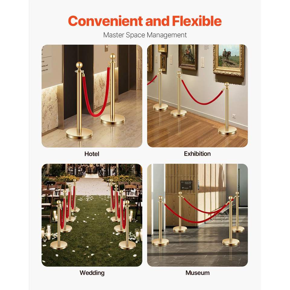 4 postes de acero inoxidable con base hueca y cuerdas de terciopelo, 2 postes de terciopelo rojo, barreras de control de tráfico, control de multitudes G