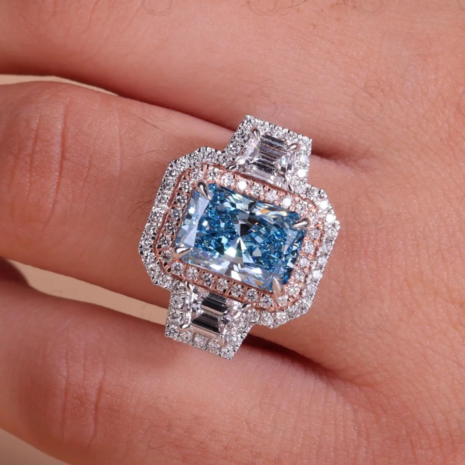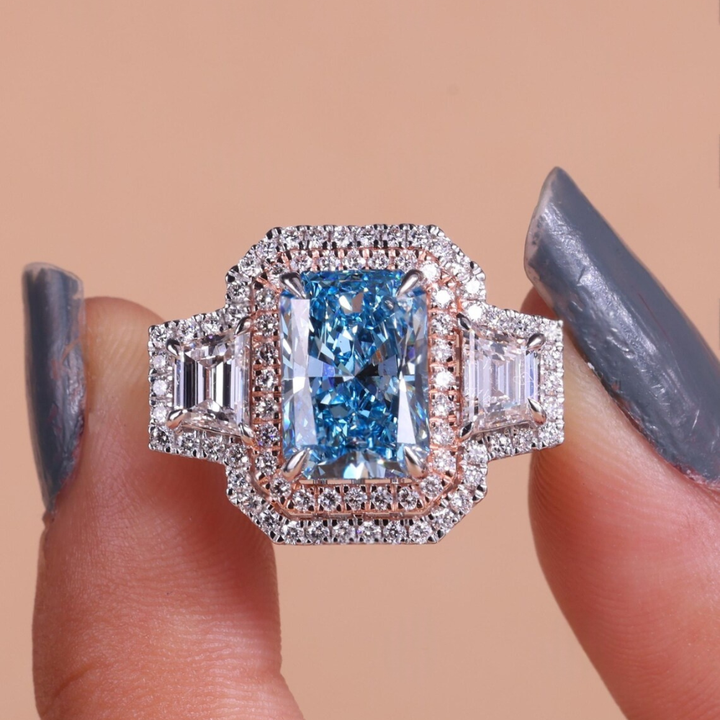 Anillo de Boda de Diamante Cultivado en Laboratorio de 4 Quilates, Corte Radiante Azul Fantasía, Tres Piedras, Doble Halo, Oro Blanco de 14K, Chapado en Rodio, para Mujer