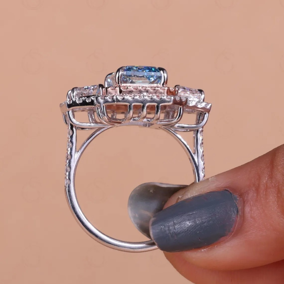 Nombre del Producto:Anillo de tres piedras con doble halo de diamantes de laboratorio de 4 quilates