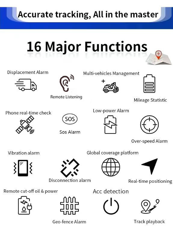 vista de la calle, Detección del CAC, -Velocidad de alerta, De camino de reproducción, Geovalla, Alarma de corte de energía, Alarma de vibración, Recordatorio anti-desmontaje