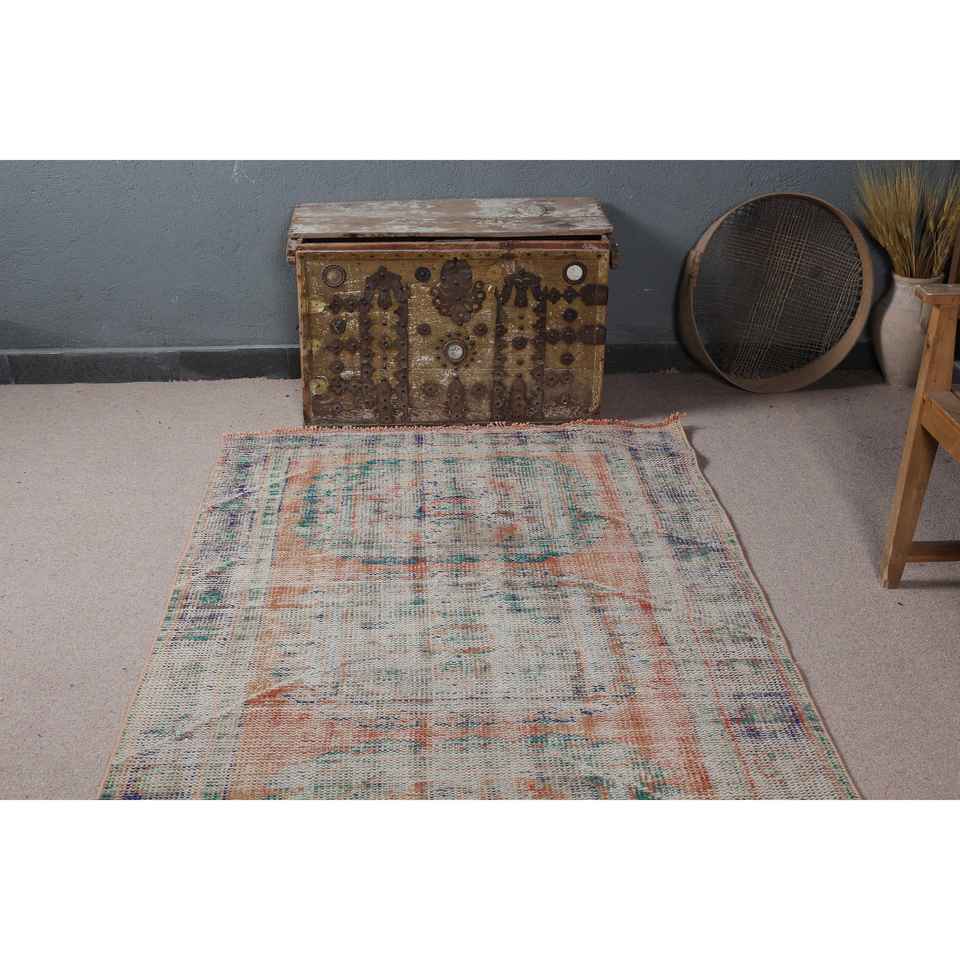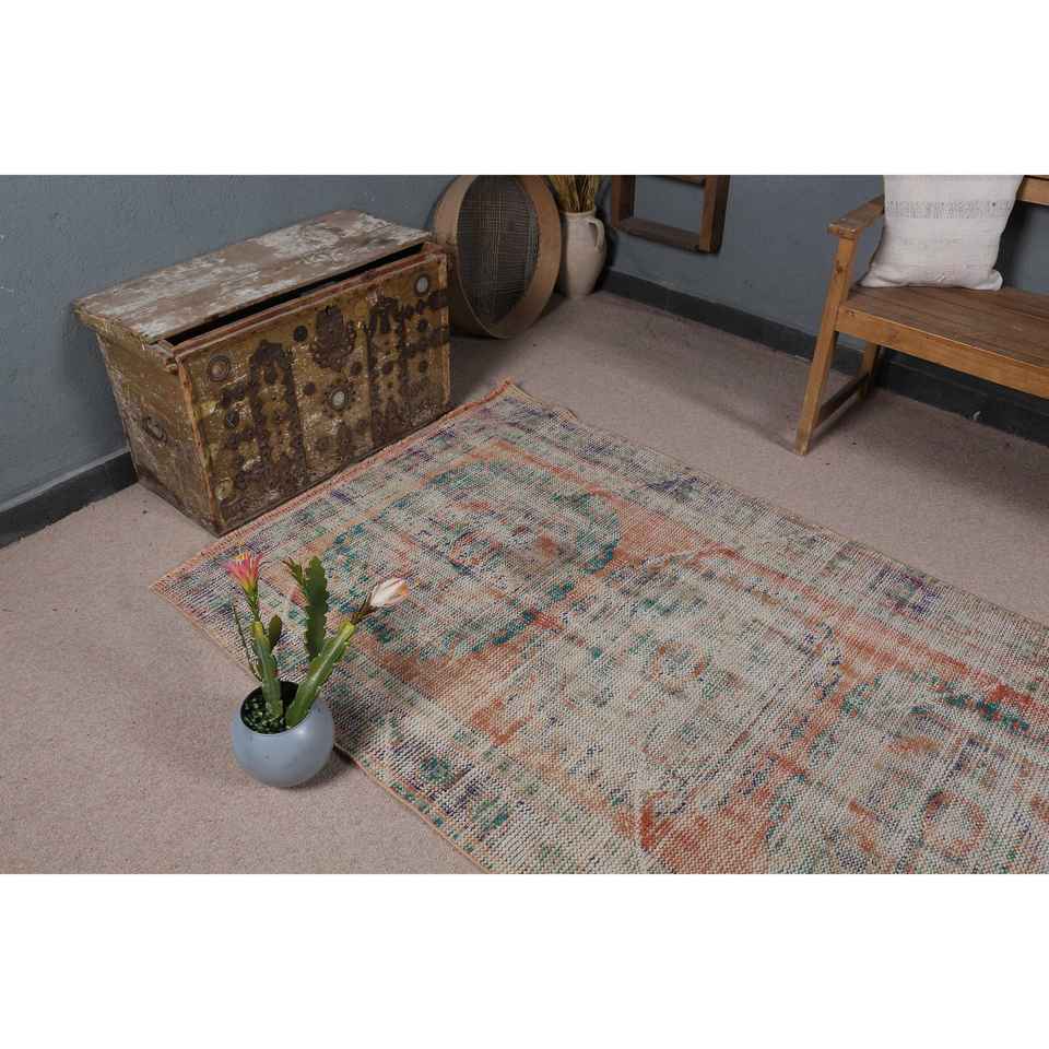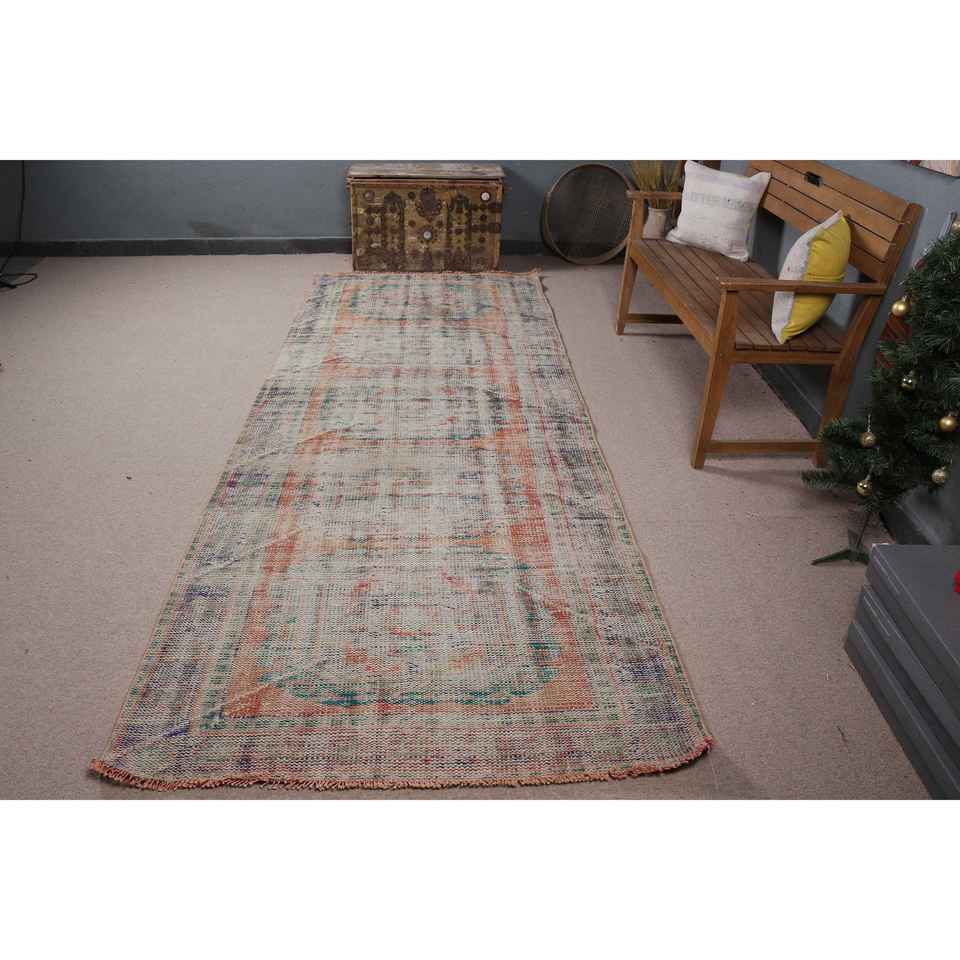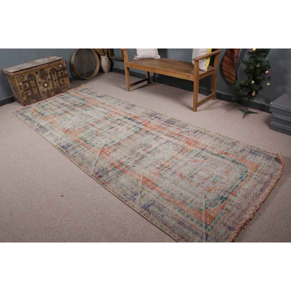 Alfombra Vintage de 4x10.8 pies, Alfombra Turca, Alfombra de Lana con Diseño Floral Azul