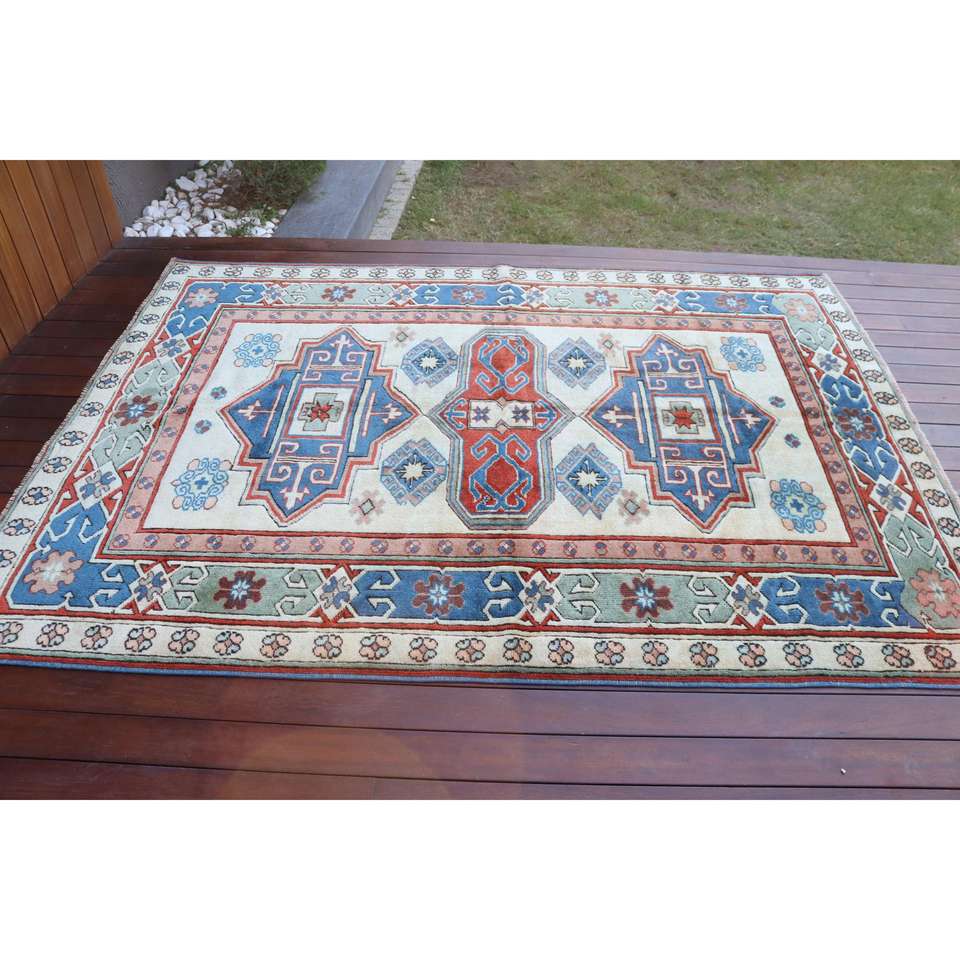 Alfombra Turca de 5.2x8.6 pies, Alfombra Vintage Azul con Diseño Floral de Lana