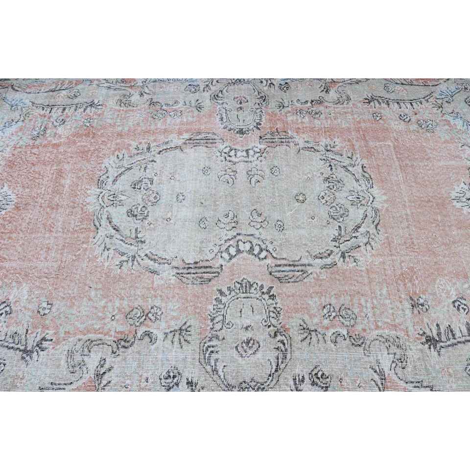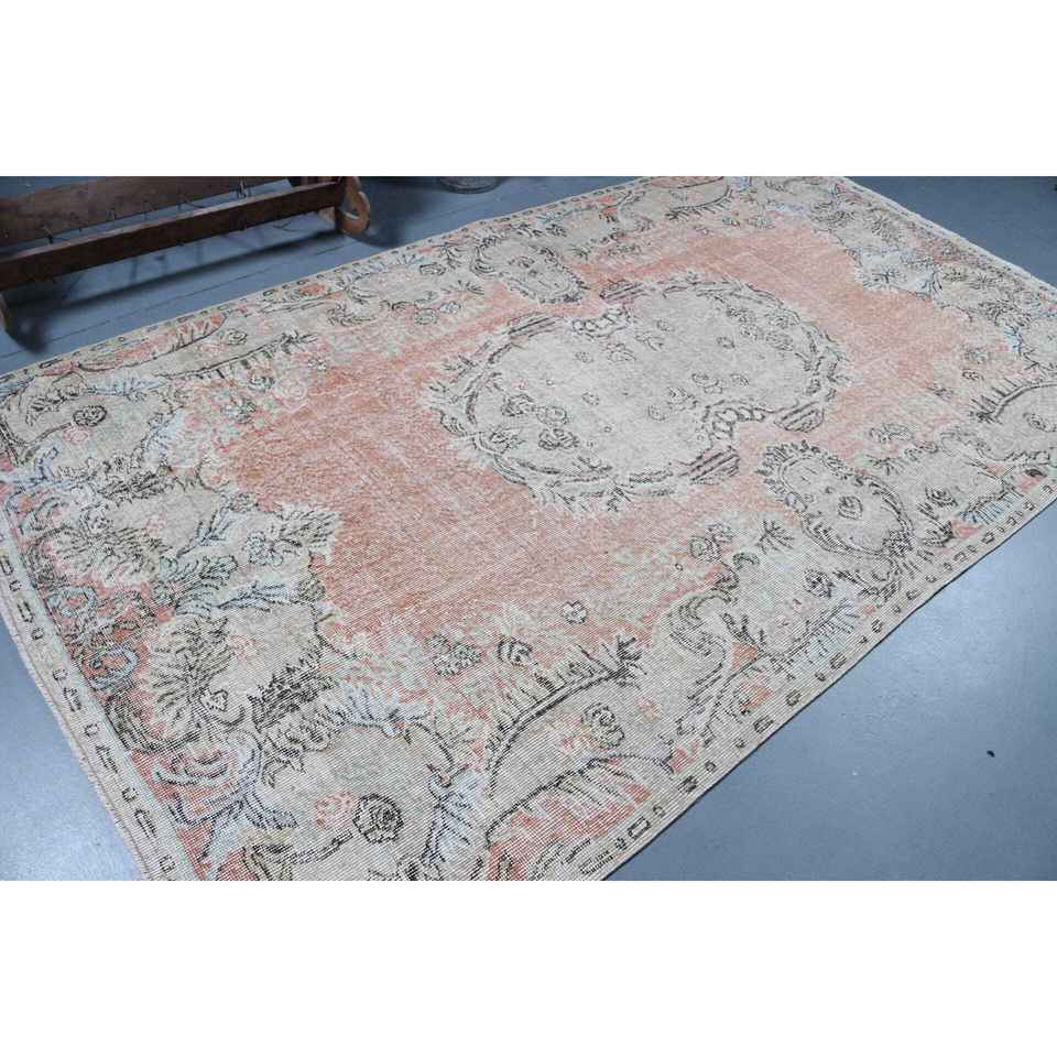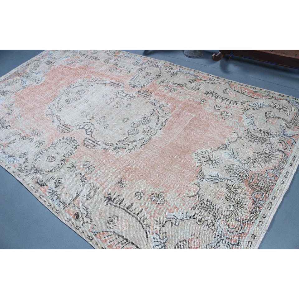 Alfombra de 5.6x9.7 pies, alfombra turca vintage, alfombra de lana con motivos de plantas y árboles en rosa y gris.