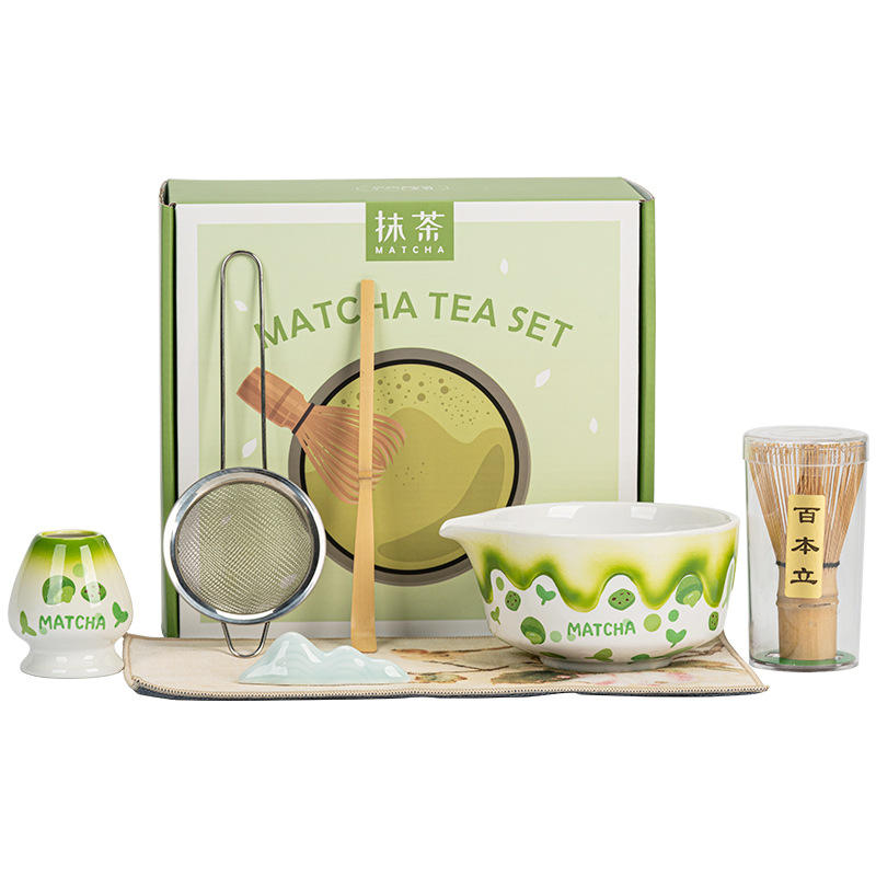 Juego de Matcha japonés de 5/7 Uds., tazón mezclador de té verde de cerámica con caño de vertido y soporte, tamiz de Matcha, cuchara batidora de Bambú