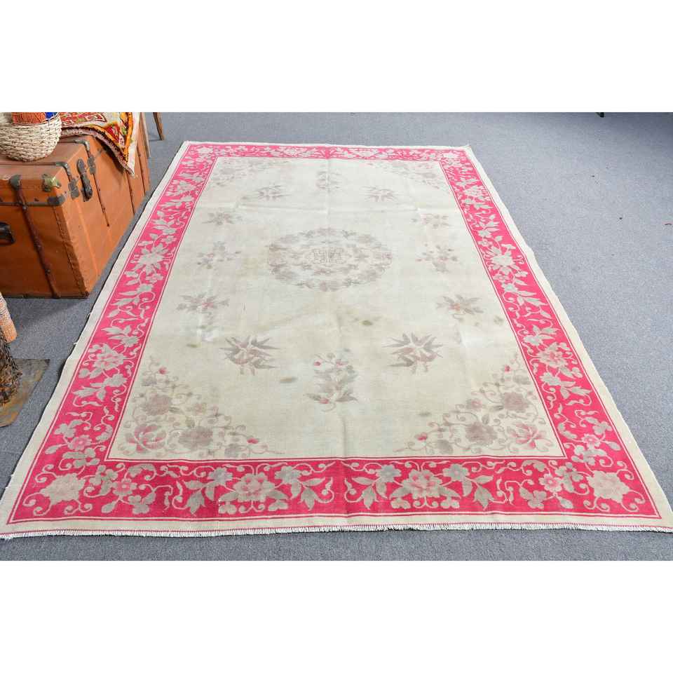Alfombra vintage de 5.8x8.4 pies, alfombra turca grande, alfombra de lana blanca con lunares