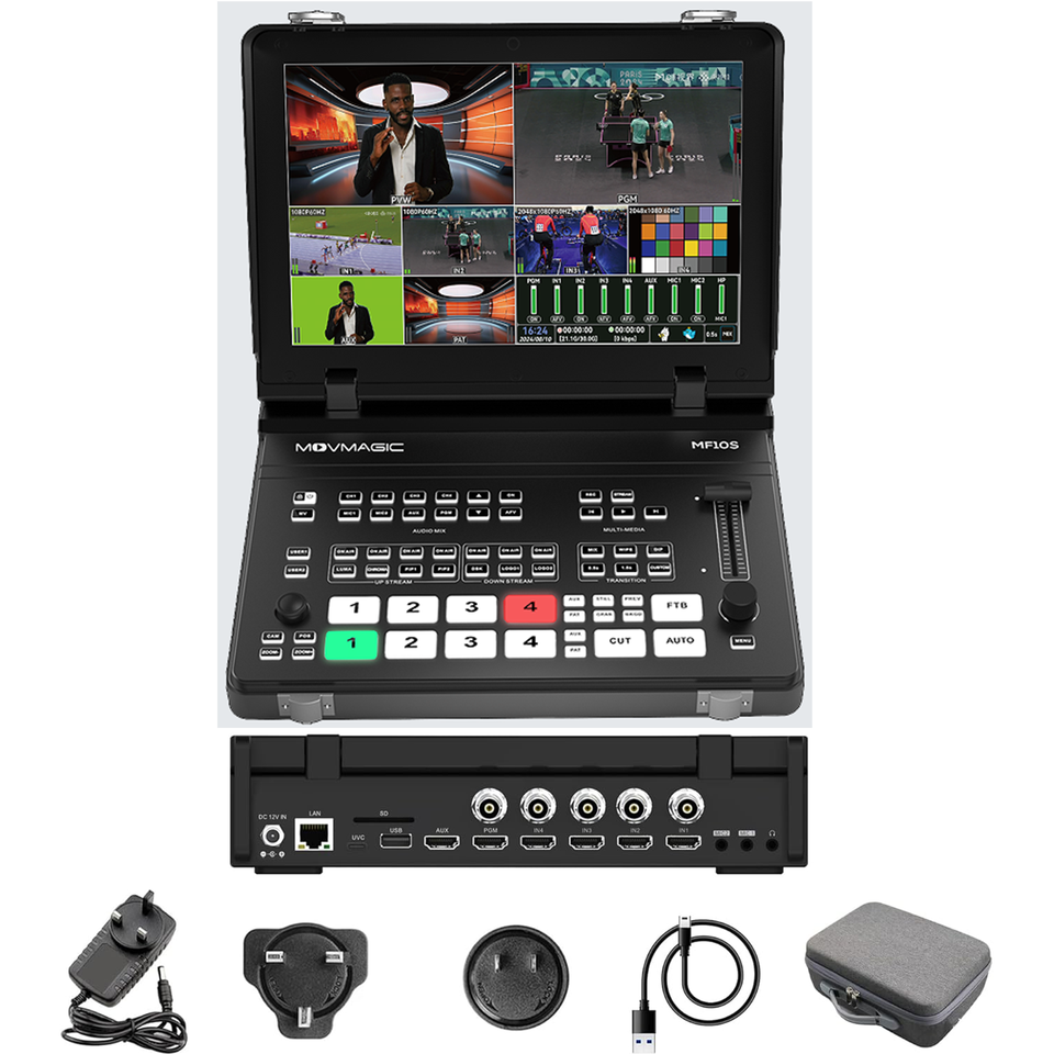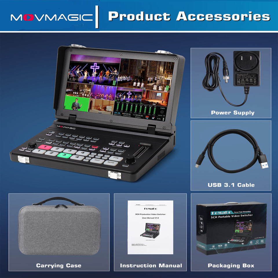 Mezclador de Video HD de 5 Canales Movmagic MF10S, Mezclador de Producción en Vivo Multicámara con Control PTZ y Función de Transmisión